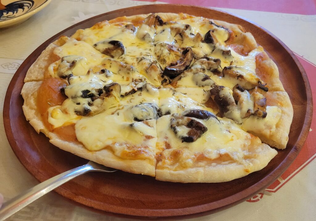 Supper was Pizza at the Meet n’ eat. First we had an appetizer of Vietnamese Spring Rolls, then we had the Organic Mushroom Pizza which had tomato sauce, basil, Parmesan and Mozzarella Cheeses, onion, and mushrooms. Our young lady hostess was more bubbly then usual and showed us how “in my country, we eat” spring rolls. After we finished I used Goggle translate and asked her what her name is. She wrote it out and said “in my country, family name is said and written first, then your given name. In your country you do given name first then other is last.” I knew this but it was interesting how she phrased it. I love how she kept saying “in my country” – she says this a lot. She is proud of her country! She’s a lovely person.
