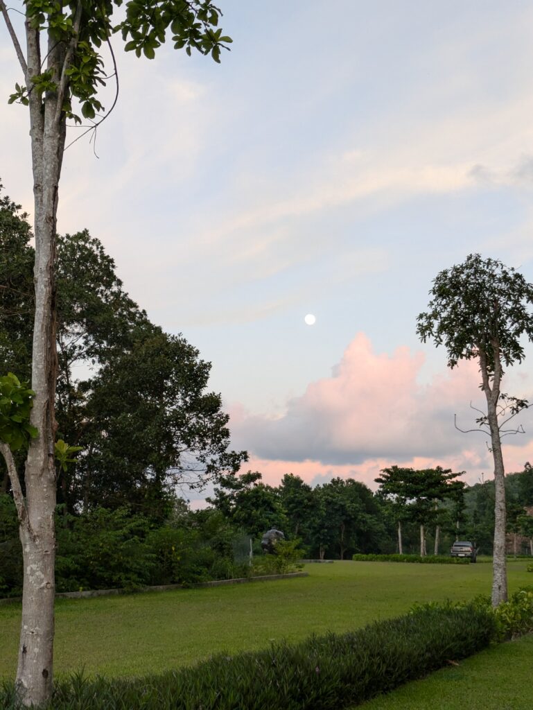 Afternoon came and went as we just hung out here. Keeping on keeping on. For supper we decided to get out and walked to the night food street area. We bought X4 sausages “little spicy” to take home. As we were waiting, I saw some popcorn! Jeff bought a small bag – it cost a $1. We ate a few bites on our way back up the hill to our condo. The popcorn was not very good and we saved it for after supper. Later we had a mini watermelon as well. We did notice the moon rise and that it is almost full.
