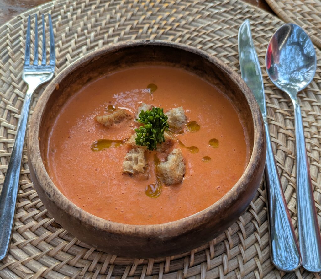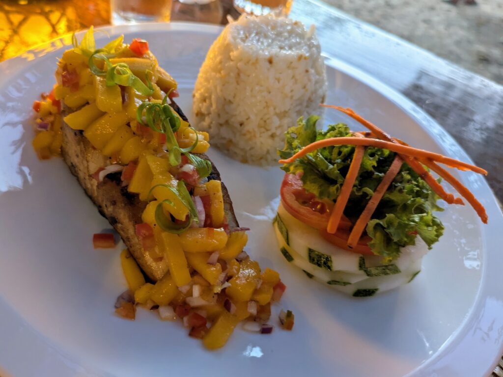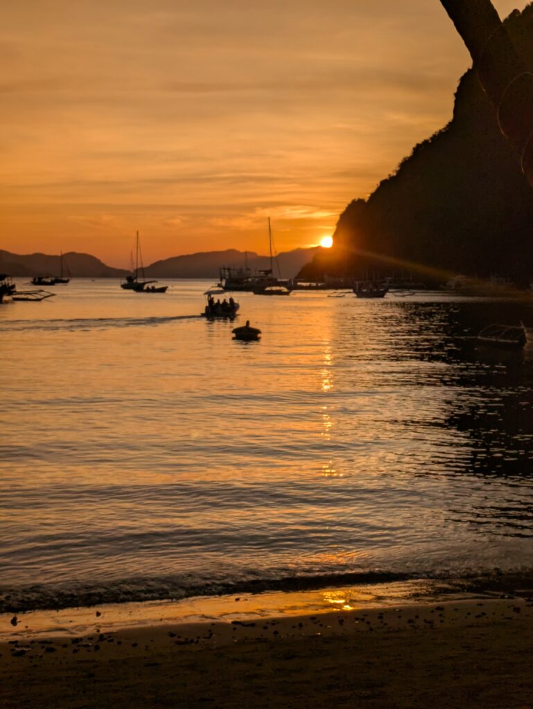 We checked in, unloaded, walked one minute to the beach, and found a restaurant to eat supper and watched the sunset. It was a great one—been a long time! We ate at Last Frontier Restaurant having a Gazpacho Soup; a Grilled Mackerel fillet topped with Mango Salsa and side of Garlic Rice; and Adobo Sa Gata- a Filipino dish with Braised Chicken simmered in coconut milk, oyster sauce, onions, bay leaf, garlic, red pepper, and green chillies (whole, thankfully – they were spicy). The whole meal was super fine. We also had two for one cocktails: El Nido Sunshine, and Rum Salabat. The sunset played out lasting almost until we finished. We even saw bats. What a welcome to El Nido.