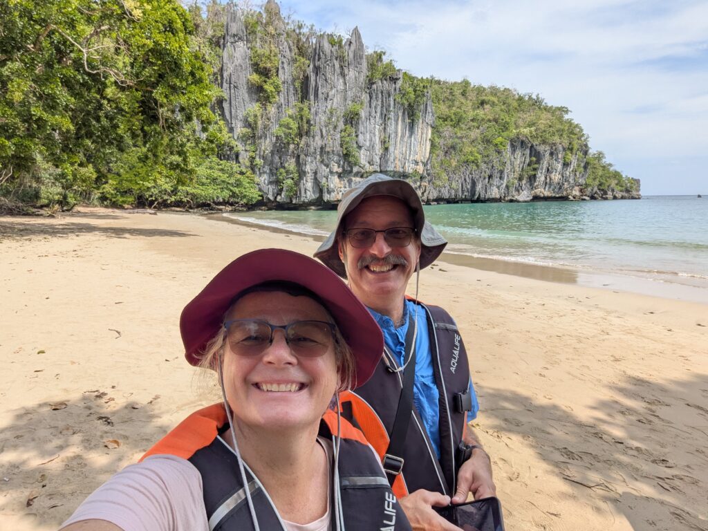 Then we found our scooter and ate at the cafe right in front of it – Winnies Eatery. For brunch😂 we had a chicken curry and a steamed fish in coconut milk with rice plus me a coke, which cost 245 PHP. Jeff had a mango shake from a juice shop out front of the cafe, that cost 150 PHP. Total price was 395 PHP, which was $6.89. Both dishes were great and hit the spot! We “scootered” back to Puerto Princesa and our place. We arrived around 1300, realizing we had not called our sisters!🤯🤣😂 We send them texts. We then took a swim in the pool and had a siesta.