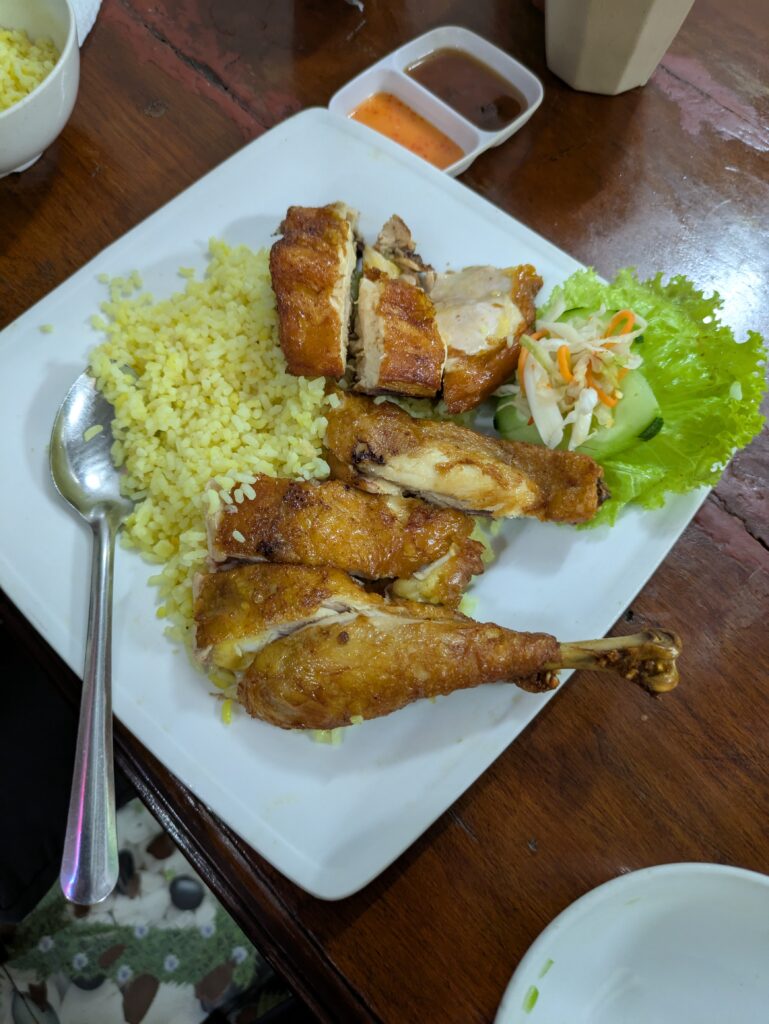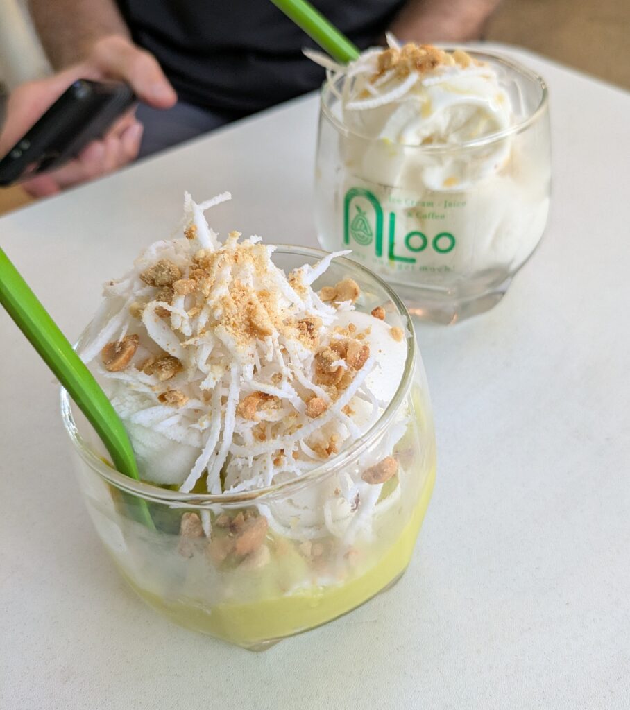 At 1230, we went out to lunch at Com Ga Ngu Vi (Five Spice Chicken Rice). We ordered and shared a roasted chicken order and sprite each. We were given a clear chicken broth consume, as a starter,simple but fresh and good. Then the roasted chicken and rice with two dipping sauces – a mildly, sweet, dark soy; and a spicy rice vinegar. Good meal! We paid 115,000 Dong for the whole meal ($4.53). Finished we meandered up half a block and across the street to Aloo. Here we ordered some dessert. I had avocado and mango ice cream, Jeff had coconut ice cream. That was 40,000 Dong ($1.58). We walked back to our place, having a small spot of rain. I just noticed a half a dozen drops. We relaxed I finished the blog and Jeff did the final edit. At 1420, Jeff sent a WhatsApp to our hostess. A different lady cleared us and we caught a Grab taxi to the train station. We arrived at 1500, and our train was due in on time. We were left out to go to track #3 at 1510. These stations are so small we all just walk across the other tracks! I also realized no one checked our tickets! 1515 our train came rolling in. We boarded. Train left one minute late at 1530. We noticed the only other foreigners boarding here were a couple – I had seen them before, somewhere I think??