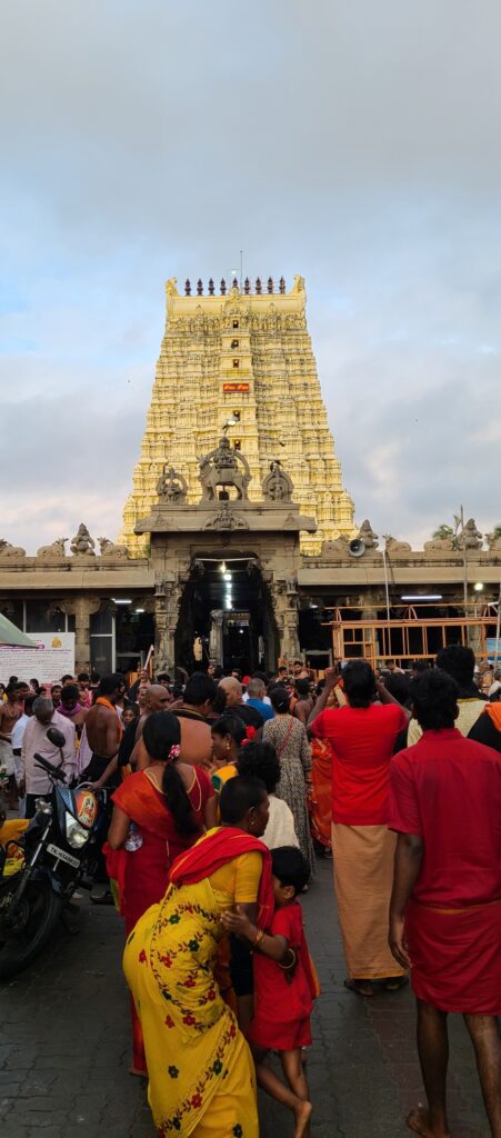 We boarded the train last night, and left around ten pm. Jeff and I are in the same car, but he is berth #8, I’m berth #64. We both were able to sleep some. We arrived at Ramanathapuram around 410 am. We hired a tuk-tuk, around 430, to take us on into Rameswaram. It is a hour plus ride – not the most comfortable way to get there but the “natural AC” felt invigorating. We arrived at our hotel, Hotel Rameswaram Grand, in the dark it is just before six. They had our reservation (that was a relief, by itself) and could store or luggage til we are able to check in at noon. We have all morning. We set out trekking. In general, this city seems poorer – first impression. There were more homeless about, but we have not been out this early anywhere else. There are definitely more cows, some goats, dogs, and our first Indian pig, just randomly strolling about, foraging for food. This all combines to having more trash and ‘natural’ waste all about. Little history: this town is a pilgrimage town for Hindu believers, like once in a lifetime journey. Similar, as Mecca is for Muslims, or maybe even, Jerusalem is for Christians. So it is a destination place, and the town itself is not very big – 60,000 population. Also the town is on an island off mainland India, linked by a bridge, which we still have yet to see since it was dark when we crossed. Needless to say, we were able to see the city awaken and the temple loudspeakers singing to bring in worshippers.