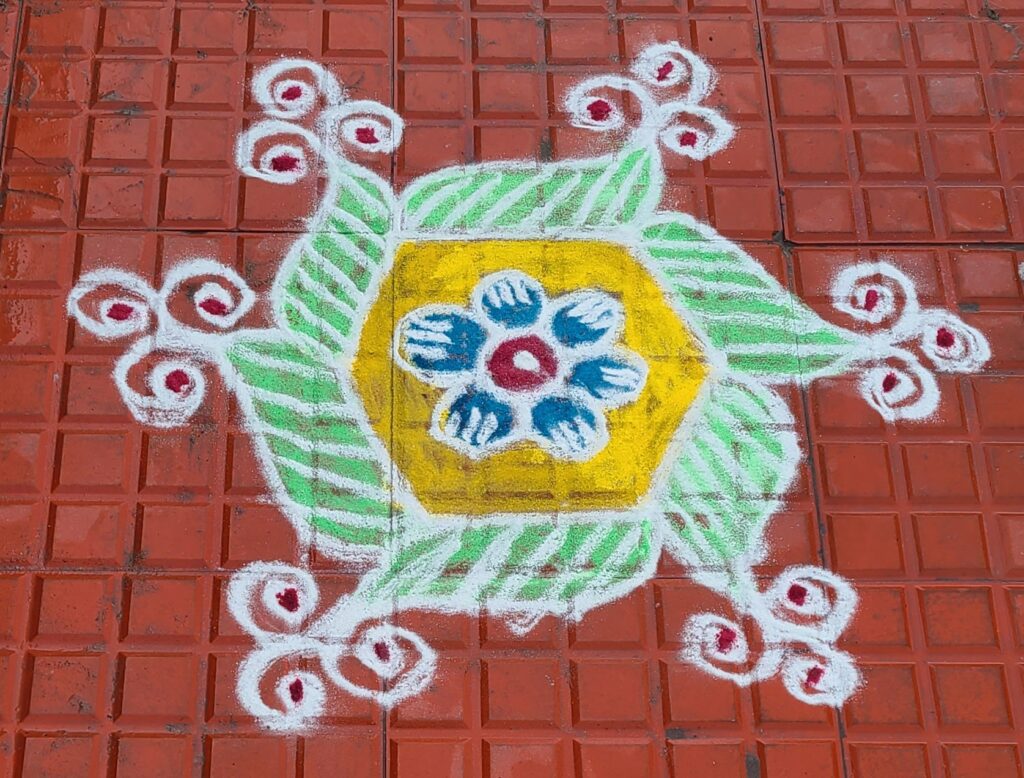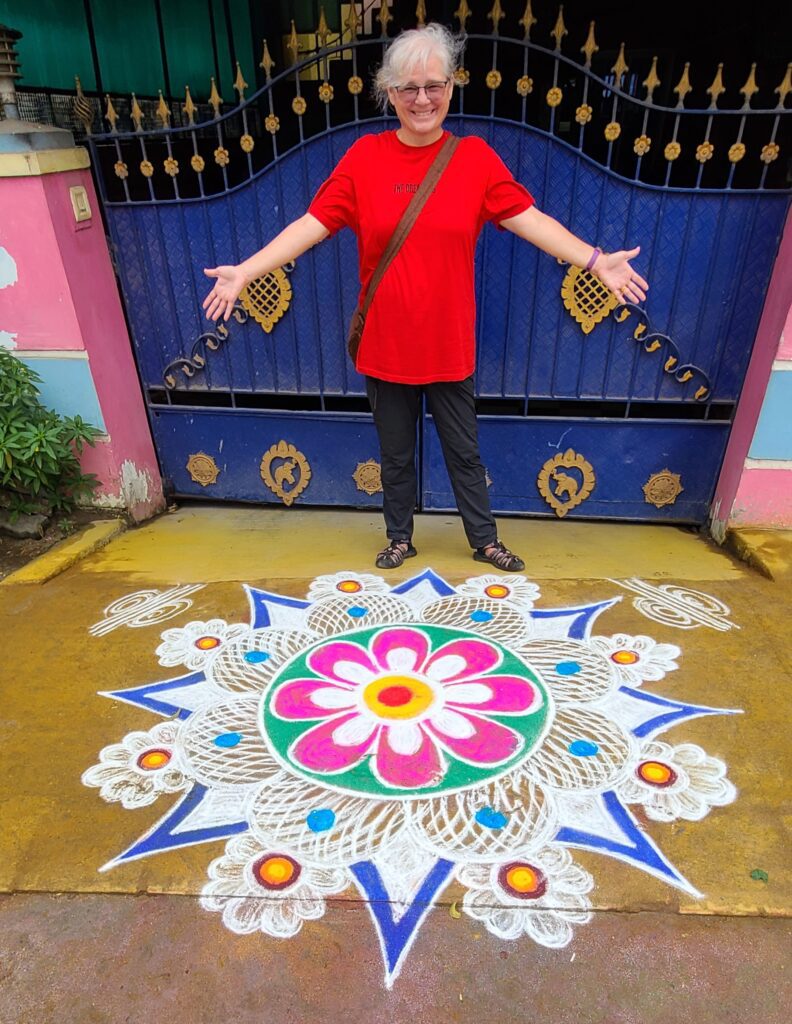 We dipped into a restaurant, Devasthanam Restaurant. We both had two drinks: Jeff masala teas, which Jeff said weren’t as good as some: me coffees, which are good but are sweeten and creamed (I like black coffee). We trekked out of the biggest part of the crowds and saw a few lesser temples, also having singing to lure in believers. As we walk, we also noticed sidewalk art (right outside of entry ways) of intricate swirls, flowers, and color. I watched a lady doing part of one such piece. they use colored powder/chalk to make them. Beautiful!