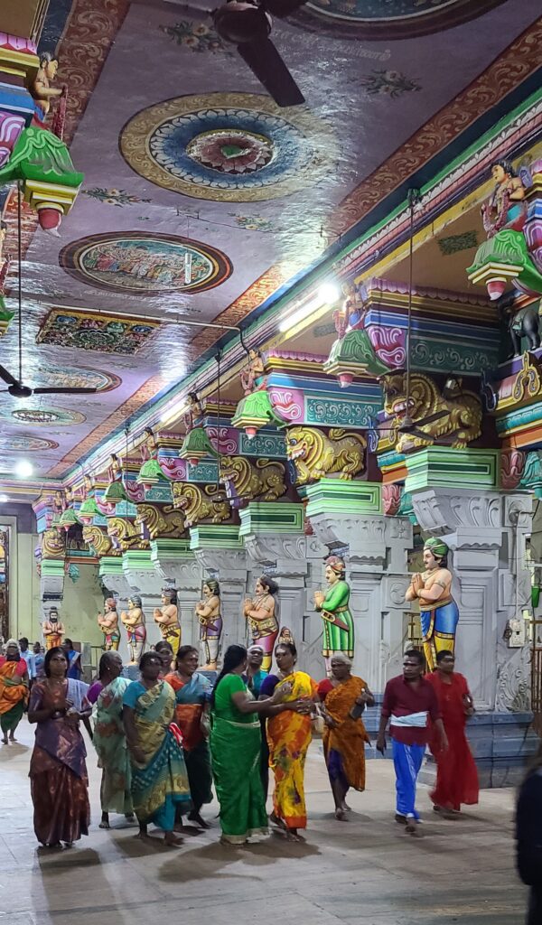There was hardly anyone there.[{I need to put in a disclaimer here: Non-Hindu people can go into temples, just not into the innermost shines.} (So I brought my sarong to wrap for a skirt, and Jeff had to wear a shirt, not a T-shirt.)] The innermost area has all the 22 pools, so we could not see them. The outer corridor was all painted columns and ceilings. There are supposedly 1,212 of these columns. I didn’t count to verify (hee-hee 😉 ). We could see into the innermost court briefly. Jeff thinks busloads of people come in the morning and leave at night, all the time. That seems to be the case today. The few that were there to worship and/or bathe were dressed all up- so many colors to go with the over-the-top painted temple. It was overwhelming to see.