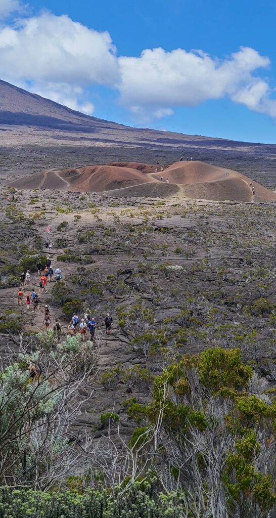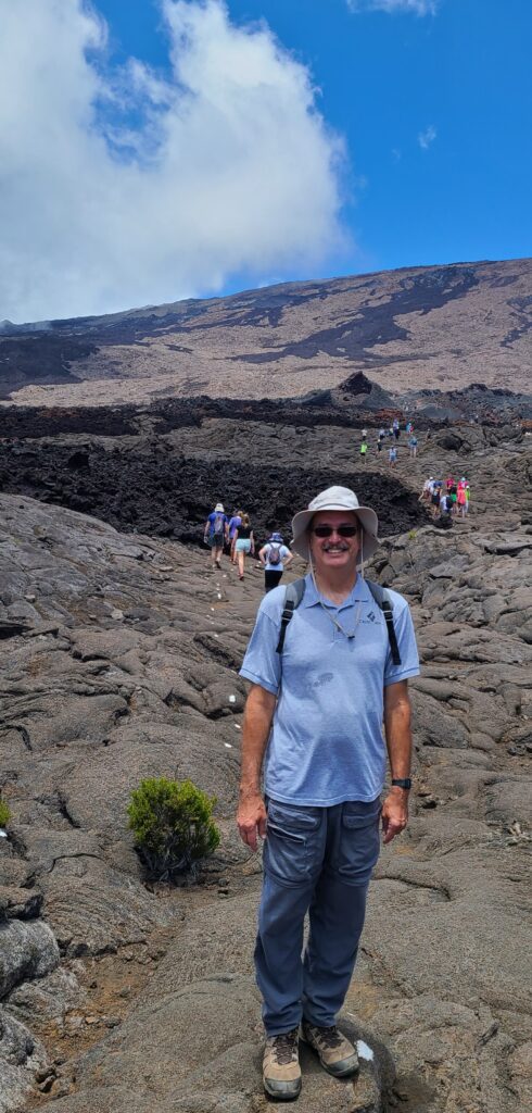Anyway, we headed out. The day is gorgeous so we want to do the hike down into the crater and around it a bit. We did stop – needed some lunch stuff and car needed gas. We drove up little roads to the Vulcan road. Along the Vulcan road is the Commersion Center and the highest elevation point. It is 2310 meters or 7580 feet up, pretty impressive sweeping views. We drove again to the the end of the road; unloaded; and hiked to the start of the trail down into the crater. The winding steps down into the crater have been built for ease, but it is seemingly unrelentless down (which means unrelentlessly going up to get out). It’s supposed to take 15 minutes, but we took our time and stopped for people coming up/leaving. It took us 25 minutes. When we started, clouds rolled in and helped keep it cool, a nice benefit. At the expansive crater bottom we followed the painted white dotted line along the various lava flows, which created that huge moonscape area. Plants are trying to make a come back, but not succeeding as yet. A little lava cone developed in a 1753 eruption and is situated in the middle of the crater moonscape. It seems really new, but just shows how unforgiving lava ground can be.