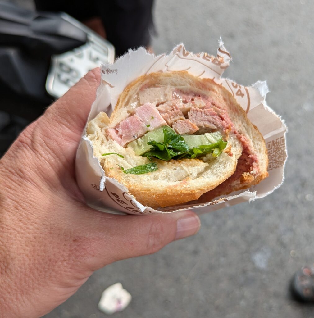 Next place, Banh Mi 24 for, of course… “Banh Mi: the best-known baguette in the world” and “Vietnam’s #1 street food.” We had a choice of assorted cold cut meats, which was sliced pork & brisket (called Banh Mi Thit), or shredded chicken (called Bahn Mi Ga). We both chose the Thit and split a sandwich. These Banh Mi also have pate, “butter”, pickled carrot and radish, cucumber, and fresh coriander (cilantro). Very tasty!