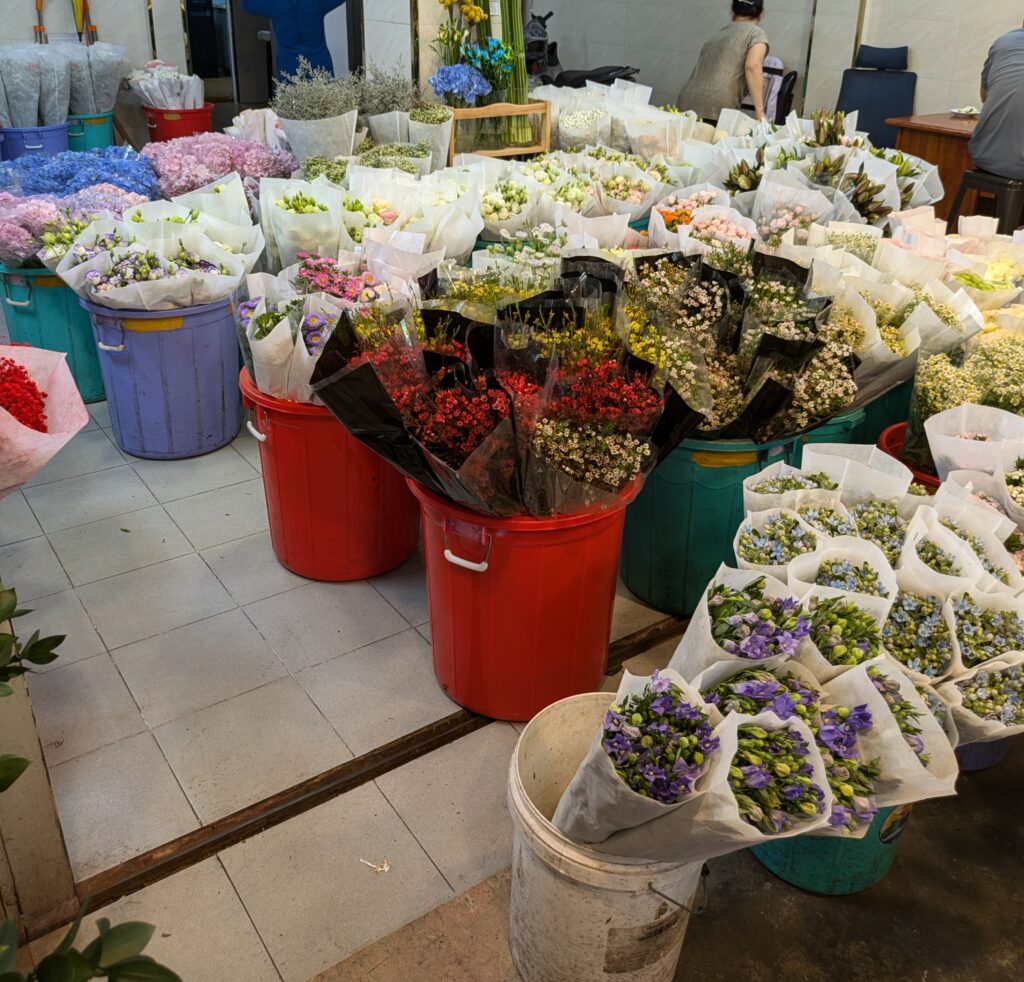 Next our convey of four motorbikes played follow-the-leader through crazy traffic weaving and bobbing to the “Fresh Flower market of HCMC and largest in Vietnam,” according to An now walking us about. So many stalls next to each other with so many different flowers and greens for bouquets. A sea of colors! We saw some six foot tall wreaths being loaded up on scooters for delivery. What gets transported on scooters… well it is unbelievable! From here we walked through “Cambodia Town” in Saigon (like China Town in San Francisco), but An said only Vietnamese live here now. This is where more street food stalls are and little shops. We see all kinds of activity: people cooking away; washing dishes; setting up or taking down stalls; just selling clothes; or selling Black-hooded Oriels. Our tour host, An, has circled us back to a set up table. The other tour hosts had been here visiting many stalls, getting us… more food!