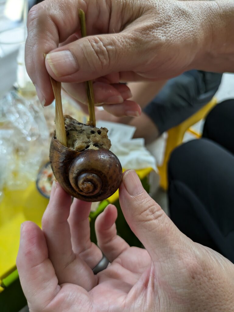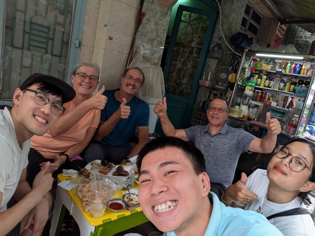 This is our last eating/tour place, and we are given many kinds of foods! First we are given an iced beverage – I had a cane juice with kumquat (a kind of lemon), Jeff a passionfruit one. Then the dishes came. BBQ Beef wrapped in Betel leaf, and Ground Beef around lemongrass stalk with chilli/fish sauce and some holy basil and pickled greens; Fried Spring Rolls with pork mince and herbs; Spring Rolls in Rice Paper with all manner of greens- mint, basil, lettuce, etc. and a peanut dipping sauce; Grilled oyster with Quail Egg topped with crispy shallots and three different sauces; Banh Khot, which is a crispy, savory Pancake (rice flour, egg, coconut milk and turmeric – shaped like little bowls) with three different toppings of Calamari, Shrimp, or Quail egg; and then Snails, the snail meat had been taken out and mixed with lemongrass, herbs and pork(?- not sure all the ingredients), cooked, and returned into the shell with a lemon grass blade to aid in extracting the meat- once extracted dip in a chilli sauce; and lastly… a Flan cake served in a coconut milk/coffee ice bath.