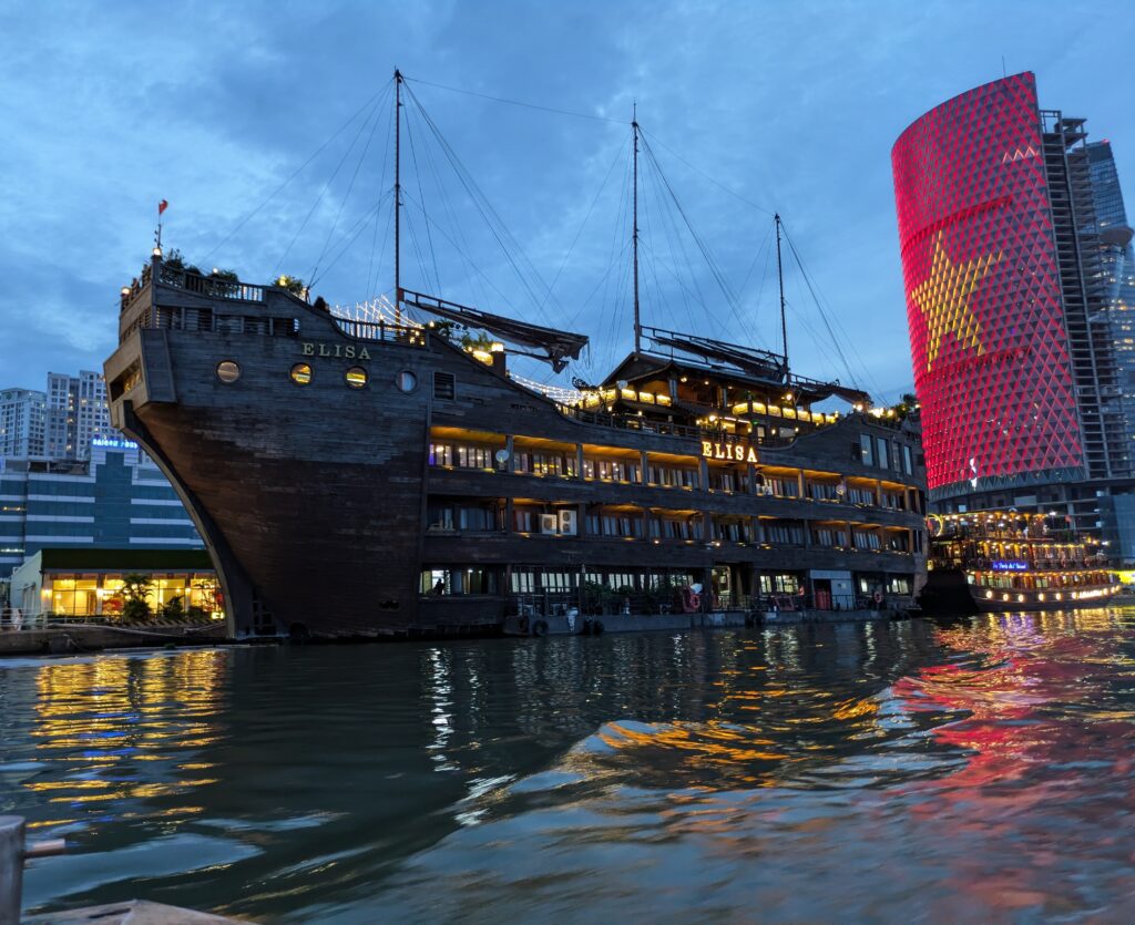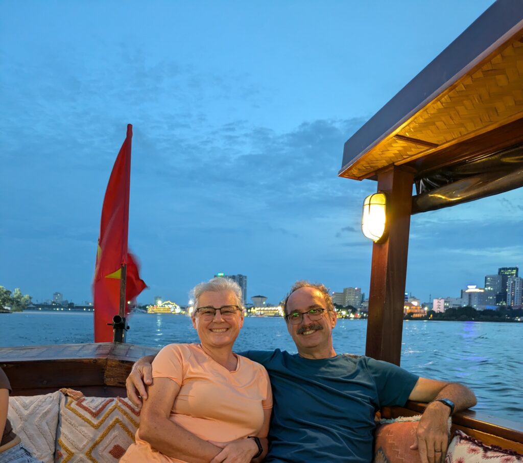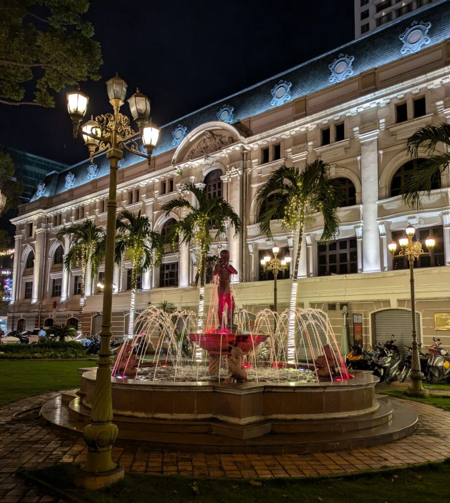 At 1730 we ordered a taxi and went to Saigon River. We had a 1800 reservation for a boat tour of the main part of HCMC. We had traffic issues, our boat tour company even talked with us, to make sure we were still coming. We arrived at 1755 – Jeff gave our taxi guy a big tip. We all, 15 of us loaded on a cute boat. We sat and they rolled back the retractable roof. Awesome! The lights of the city and buildings started coming on and we cruised down and back up the Saigon River for one hour with a little commentary of the various skyscraper buildings, the largest lit up screen in Vietnam and SE Asia(?3,000sqm- which is 32,300sqft); and the districts we were passing through. When we finished we walked back going by the Opera House and the Post Office – both cool buildings!