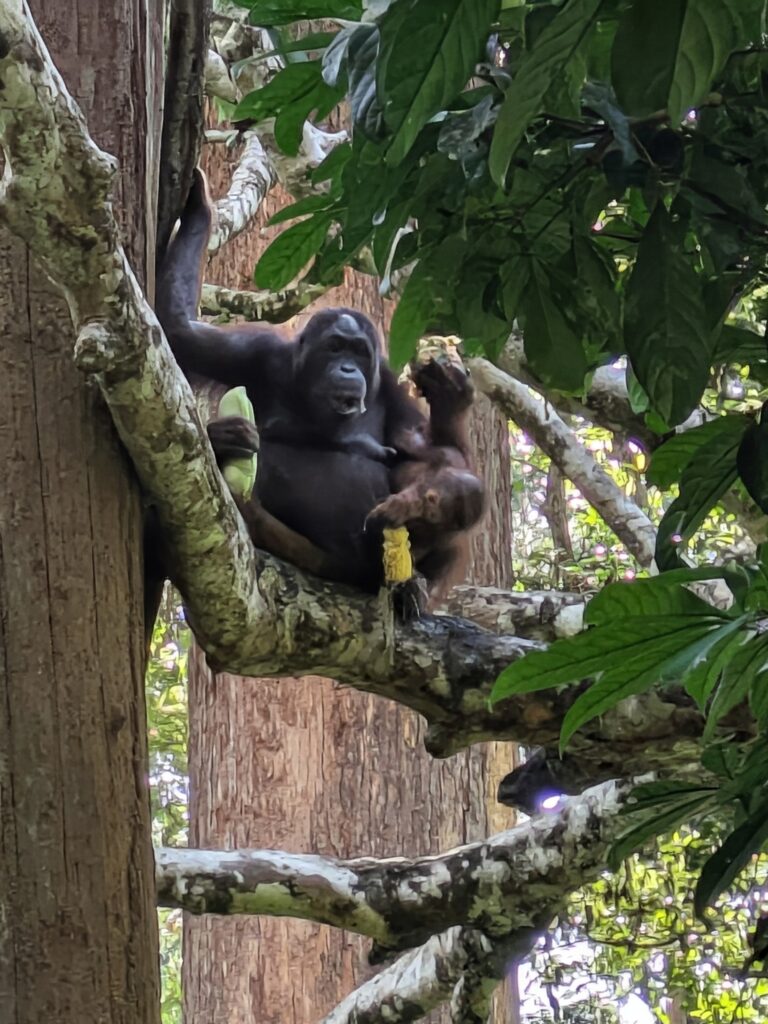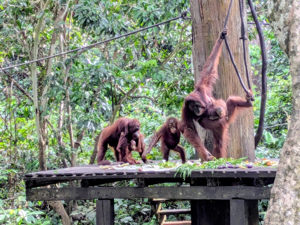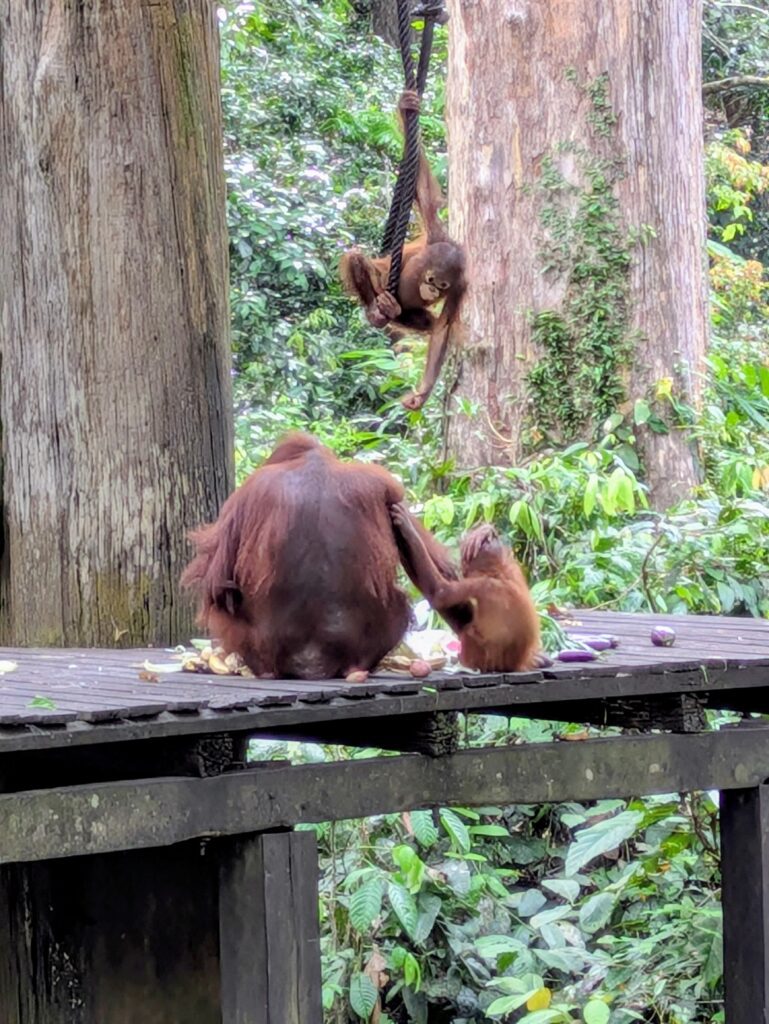 We had plans today, so we awoke and readied. Our booking of this apartment includes breakfast and we had noodles with baby shrimp and a small package of sauce delivered at 0730. It was still warm but neither of us wanted it for breakfast. We put them in the fridge and made some oatmeal with the coconut jam. Once finished, we headed out jumping on our scooter. We are going to the Sepilok Orangutan Rehabilitation Center. This center was established in 1964! Open time is at 0900, and it took about 30 minutes to get there. We did have to stop for gas, but finally, we arrived and paid the entry fee of 30 Ringgit each, which is $7.07 each. With our tickets in hand, we entered by 0910. We meander through lots of jungle on a board walkway following the group, thankfully the most of which is behind us. There were a number of people, and we were all going to one place – the feeding platform. Everyday at 1000 and 1500 this place puts out food for Orangutans. There are no fences, just a platform with many ropes leading to it. The people have our own platform of sorts, I suppose you could say – a covered sitting/standing observation area. As we found a place and staked our claimed spot, more came to fill in around us. Around 0930, a troop of Macaque monkeys came for “the show before the show” – so to speak. There were some babies putting on antics.