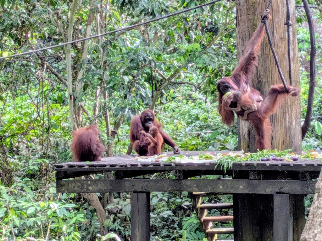 Now we went for lunch at Kafeteria Sepilok. We had Lemon Rice Chicken and Beef Rendang with Rice. I had a lemon Iced Tea and Jeff stuck with water. The meal cost us 46 Ringgit, or $10.85. We sat and took our time, trying to stay cool out of the sun and kill time. Around 1340, we crossed the road back to the Sepilok Orangutan Rehabilitation Centre and stood in a shaded line for re-entry. It reopened at 1400. We arrived at the feeding platform by 1410. We were the first ones and had it to ourselves for quite some time. We noticed the mother and baby – might be the same ones… I couldn’t tell. The area was very quiet with just us and the two Orangutans for quite some time. It was surreal! There were not any Macaque Monkeys!?! Other people finally started filing in. I pointed out the mom and babe to the first few, but then I just enjoyed watching the Orangutans, as they watched us and the groups of people coming. On time again the same person came out with the basket. He followed the same procedure as this morning. The mom and babe swung done right after he left. Next were a couple of brave squirrels. Then further down the boardwalk, new Orangutans- mother and baby came. People were cleared back some distance so the mom could come- walking the railing like a balance beam! She then swung up over our heads on the lattice rooftop, catching a rope to go to the platform. That was exciting. This mom was submissive to the other first mom. But the first mom let her “stay” off on the edge of the platform. The first baby was a bit of a bully to the second baby, but they were both eating. Next another mother and baby came, and everyone cleared out. This must be an alpha female and her baby was younger. As she ate, the first mom and baby left. The second mom and babe seemed to cower to the very edge – this mom had not eaten much yet. As the alpha mom was eating and “teenage” Orangutan showed up and sat on a corner finding some food, but it came too close to the cache once and the alpha mom swatted at it. We wondered if this was one of her older offspring? Anyway, it was a fascinating feeding session- seeing some interaction, and all the babies… plus don’t forget the squirrels.