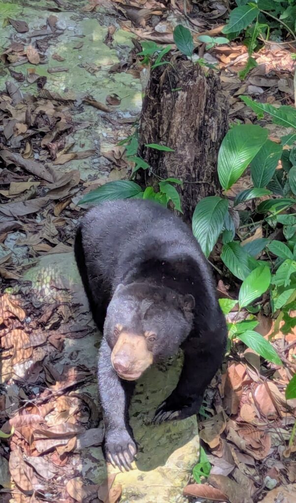 Then a ways off from the opposite side of our viewing, there was a rustling among small trees, moving in. Like magic a mother and baby Orangutan appeared. After the initial gasps from everyone, it quieted down (mostly due to the staff announcing silence). The mother with the baby clutched around her torso swung and kind of lumbered in. Then she used one of the ropes to move to a place where she could sit and watch. The baby then moved about some around her, because well, sitting… boring. We all watched them and the mother watched us. The Macaques are all still bouncing around. At precisely 1000 a man showed up with a three foot basket “backpack.” The monkeys settled down, and everyone was watching him. He climbed to the top of the steps of the platform and set the basket down; unstrapped the basket; and emptied the contents on the platform. He put the basket back on and left the platform. As soon as he was cleared out, the Orangutan mother with the baby hanging on swung onto the ropes to the platform. She looked at the food and took a couple of pieces of leaf lettuce and grabbed her baby, reversing herself off the platform on the ropes to a safe distance away. As soon as she was off the platform the Macaques streamed in, by ranking I suppose. It surprised me the actual seeming order of it all, and how little the Orangutan took from the pile of food. By 1030 the Orangutans were sitting off, out of view. Only could see the baby when it was doing some climbing moves. The Macaques were still at the food, but we were ready to move on, as most other people already have. It was great seeing the Orangutans: mother and her baby. But seeing them, brought up many questions. Like: Why did the mother only take so little food?; and Isn’t this more a dependency issue vs. a rehabilitation situation?❓ We then went briefly to the nursery platform, but this was behind glass- unfortunate. We went back along the boardwalk, as through our first platform area, some people were clustered together with a staff member looking at “Gibbons.” We stayed a bit, but never really saw them. They were high up a tree in a nest. With all the leaves and nesting material, we could only see movement of leaves. We walked back out along the boardwalk, excited that we had seen a momma and baby orangutan! We will definitely come back for the second feeding. We exited and literally crossed a small road to go to the Bornean Sun Bear Conservation Centre (BSBCC).