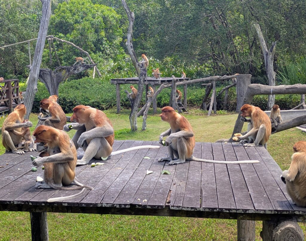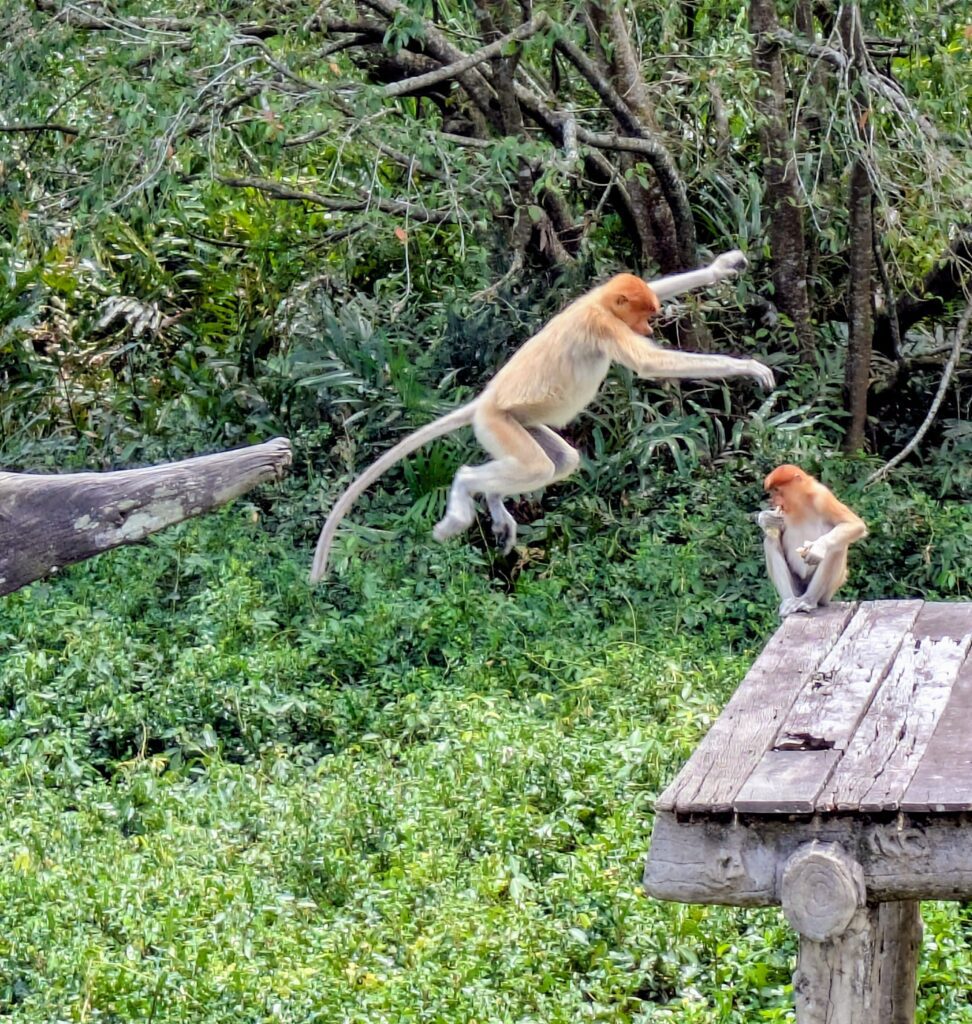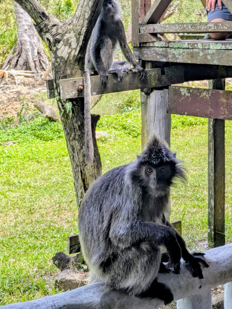 About then it was time to feed the Proboscis Monkeys and staff brought out bread and cucumber pieces, placed them on two platforms and then imitated the monkeys’ sound. They straggled in at first,but then they swarmed the two platforms. There were a large number of them, maybe thirty. The kid that counted at the other platform was not here counting. The first platform had an Alpha male in the center commandeering the biggest cache, surrounded by his “harem” of family. The second platform had a bunch of tweens, teens, and bachelors. This feeding went quickly. As the Alpha finished, he decided to jump at the viewing platform where many people quickly parted in grasps of disbelief and shrieks of fright. He just wanted to go through and like that was gone. The rest of the monkeys stayed to get the last bits. I tried to shuffle over to see where the male went, but there were too many people in my way to move quickly enough. I then saw a very different type of monkey, called a Silvered Leaf Monkey. About this time, one jumped very close to me. I had been taking a picture when the monkey did this. So I tried to move away, but kind got hemmed in with other people wanting selfies with the creature! One person even petted it!! This is not ideal and I basically pushed my way out. We people can be problems!