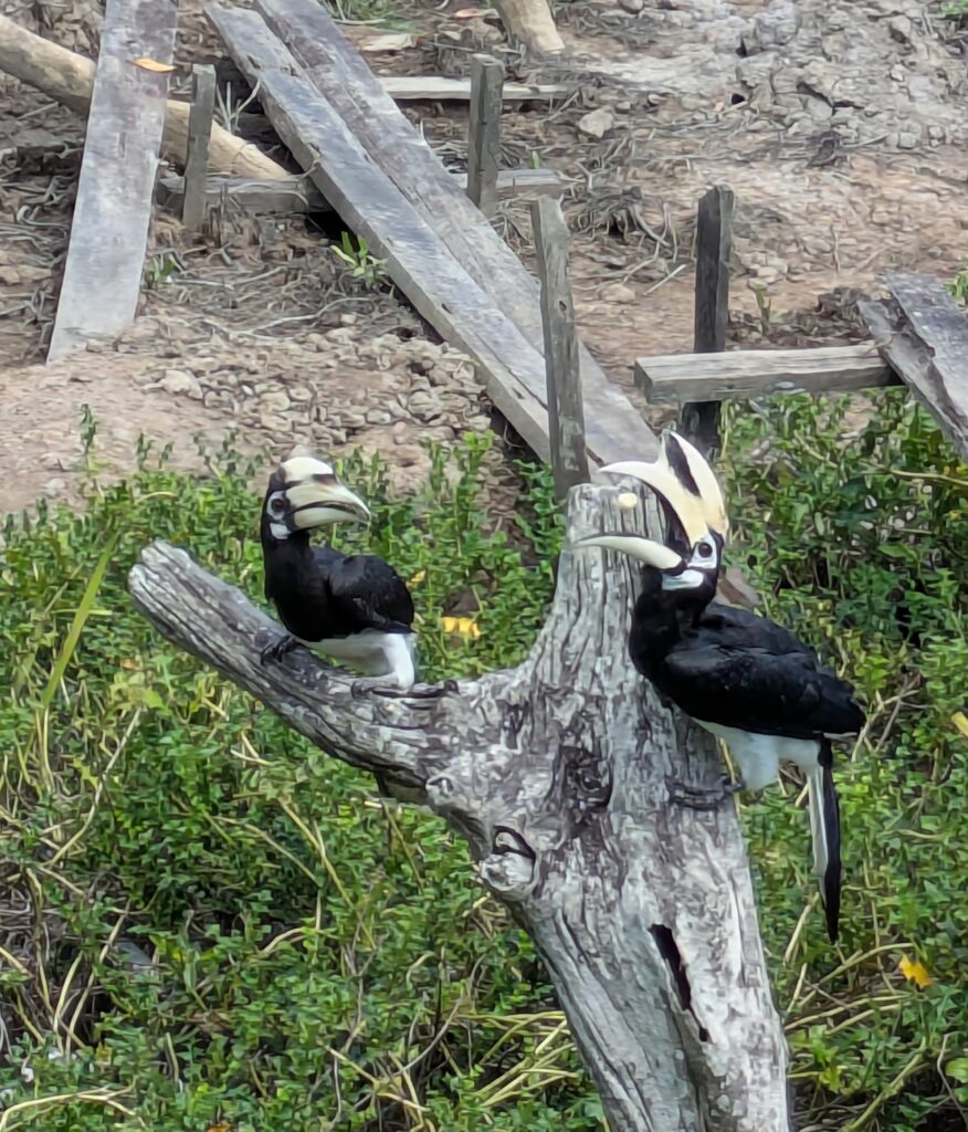 We went out to the viewing area. The platforms here were arranged in a semicircle around the viewing station. No monkeys were obviously present, but you could see them scattered about in the trees. There were two Oriental Pied Hornbills closer up and we were watching them. A staff member came out, laid out pieces of a banana on a dead tree, then stepped back, imitating the hornbill’s call. Within a minute the hornbills swopped down on the tree and feasted on the banana. That was unexpected, but spectacular to witness. Then watching them be able to pick up the banana bits in those “supersized beaks” of theirs, unreal that they can do it! The birds ate the whole banana and flew up into a tree a bit further away but still close. The staff person set out another banana, called the birds again, and left this time. The birds returned,finished this banana and then flew off. This must be done daily as well. It was great to see them up close, but I have mixed feelings about doing that. It causes a dependency issue. Anyway, this whole sanctuary and all the centers cause the same kind of dilemmas. But that is why I am here to see the wildlife feeding. It’s a hard call.