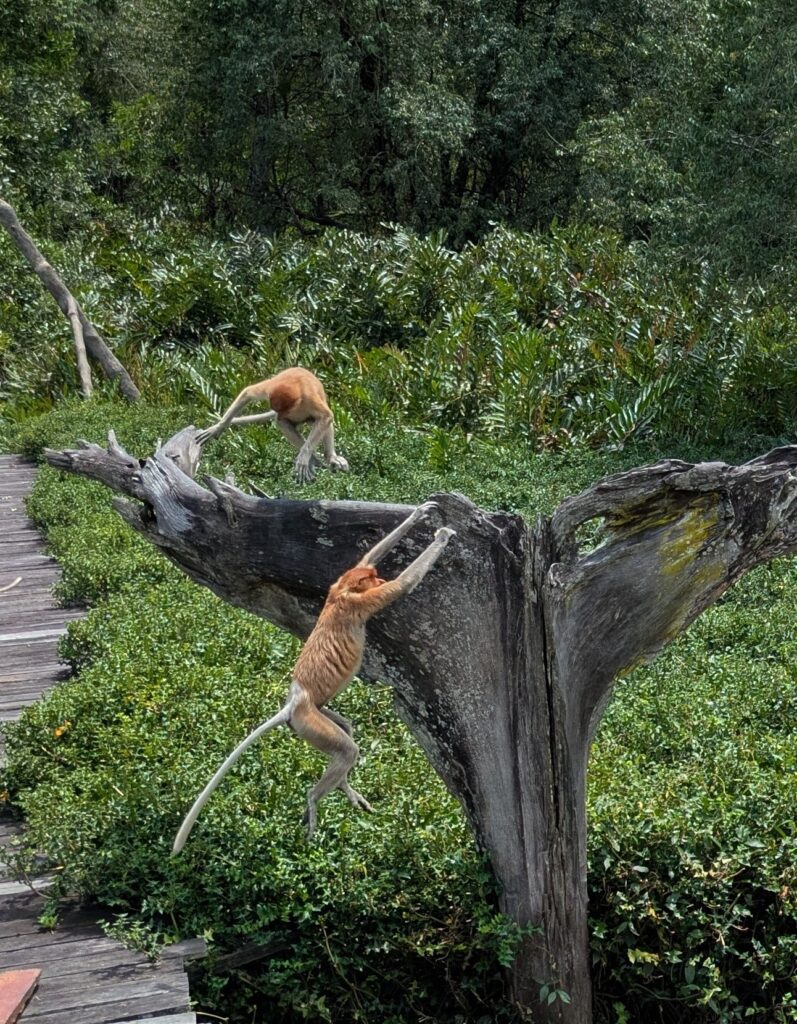Anyway, we arrived at Platform A feeding area. There are actually several platforms, stationed all around the viewing area. We were delighted to see there were already some Proboscis Monkeys here. Their noses are just so comical, proving God’s sense of humor, I suppose. On one part was a “family” or “clan”- an Alpha male and several females, many carrying babies and a few ‘tweens’ that have not been sent away yet. The other part is the young “Bachelors”. We stayed watching on the side with the family.The monkeys started coming in closer as the time drew near. I noticed there were Proboscis Monkeys only. Huh?🤔 I also noticed one of the females had a very enlarged goiter issue.