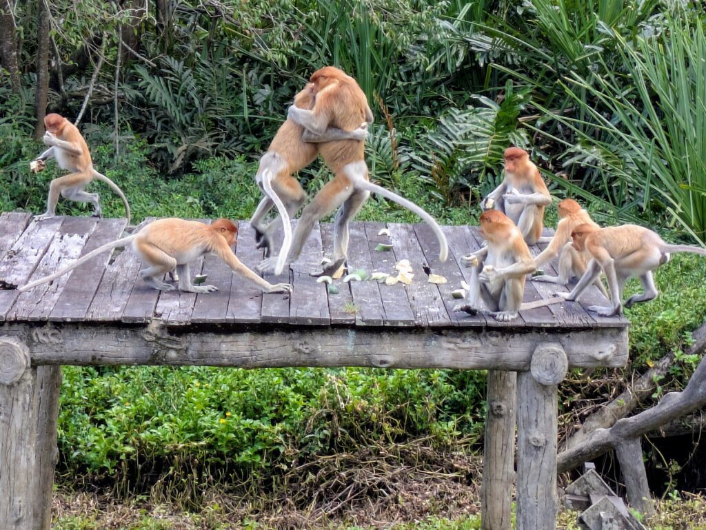 Anyway, there were around 14 monkeys – as a young boy counted and exclaimed this number. The staff brought out the food- a little late 0935. It was cut up bread (not the fruit and veg that was given to the Orangutans). The Alpha male proceeded to sit right in the middle of the platform and hoarded much of the bread. Other monkeys skittered about wherever the Alpha let them go. Some of the ‘tweens’ or moms would dart about into the Alphas cache and get verbally reprimanded with a kind of “hiss” sound. The Proboscis Monkey has a very distinct, different kind of “honking” sound. I know they aren’t geese or ducks, but if you just heard them without seeing them… Anyway, as we were watching, a female dropped her baby! It fell to the ground from the platform about 5 feet. A big gasp of disbelief came out from us onlookers. Then another female ran and snatched up the baby and carried it off. The female who had been holding the baby, looked down, but kept on eating as if nothing had happened. I can’t believe this was the mom – it offends my sensibilities.