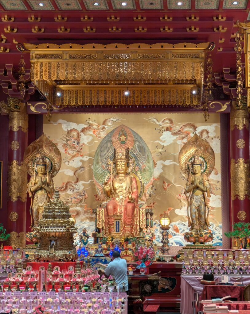 We left and walked just a bit to the Buddha Tooth Relic Temple & Museum. It was 1640 and closed at 1700. So we quickly went through it. We did not see where Buddha’s tooth was displayed, and we did not read up on it. There were like 11,000 small Buddha images lining the walls and a very prominent gold-gilded – crowned and robed – sitting Buddha display.