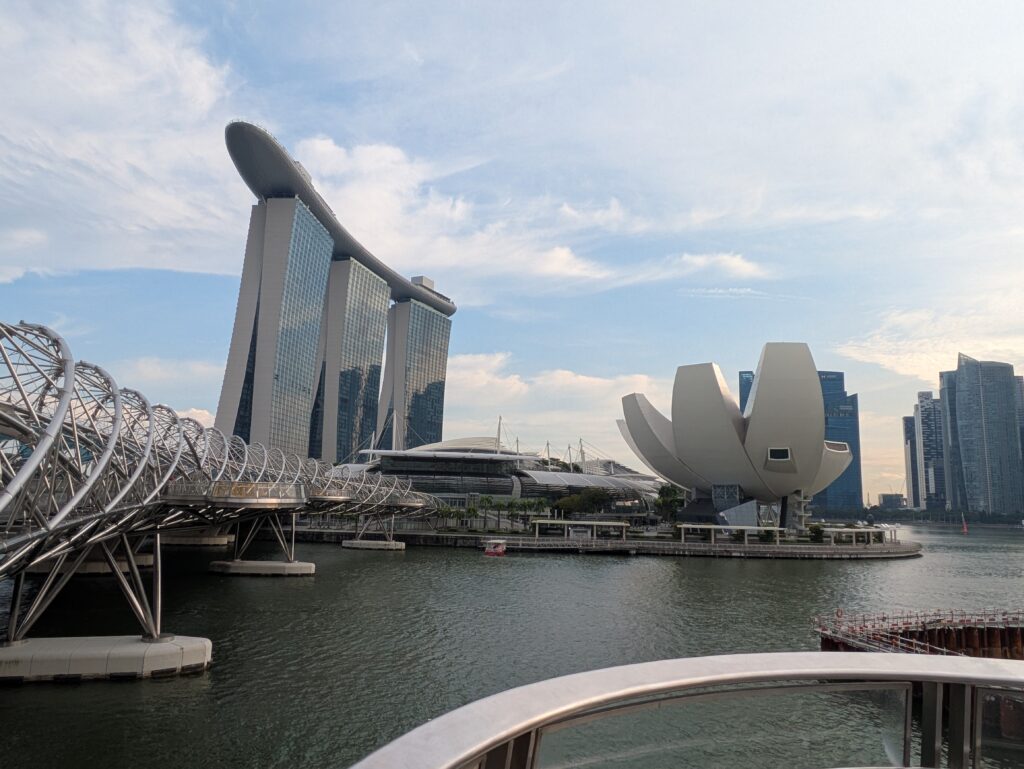 Anyway, we made to the bay and this is where most of the tourists are. The city skyline is very distinct because of a hotel building down here, The Marina Bay Sands. It is like a boat floating many stories above in the sky, anchored by three tall columns – the buildings of the hotel. It is surreal. The bay is beautiful with other skyscrapers lining the rest of the horizon, and some small sailboats sailing in the harbor. The is also some huge art sculptures: a “catcher’s mitt”, for arts science center; a Double Helix Bridge, and Merlion, sculpture of a water spewing half lion/ half mermaid. It was eclectic and fun to walk around. But we were hot and in search of refreshing drinks… they are so expensive. We finally found a 7Eleven shop – thinking it would be cheaper. Nope! We just got a mango tea. The water was outrageously priced and Jeff said not even cool, let alone cold. We drank the tea in no time and walked on. The little stands are cheaper, we found one and got two waters.