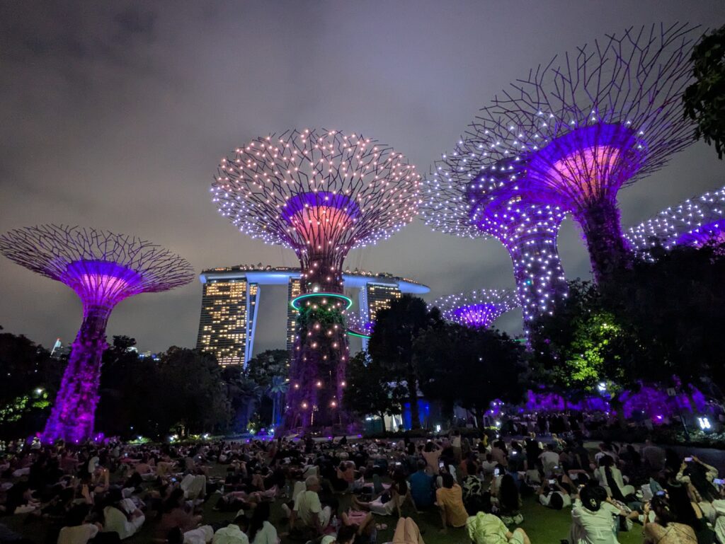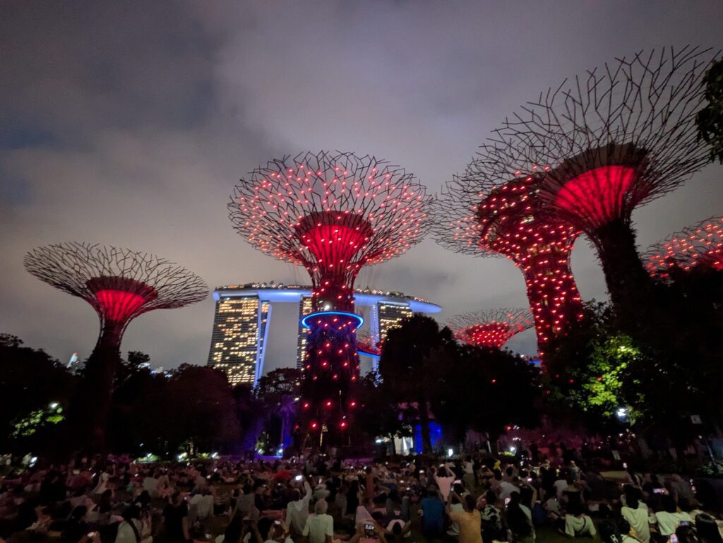 We crossed the mouth of the bay on the Double Helix Bridge, which is like a strand of DNA. Then we went to the Marina Bay Sands, which is also a very high end shopping mall. We went there to go through the complex of the three buildings to get to the other side. This is the Gardens by the Bay. Here Singapore has built a “Supertree Grove”, which is huge man-made structures that resemble trees. At night the trees pulsate with colors of light to music. We found a spot and got some water and waited 15-20 minutes for the show. All colors of the rainbow, waving all up and down the giant trees, dancing to the time of a few different waltzes! The show lasted 15 minutes and was a dazzling display, which we enjoyed very much! WOW!