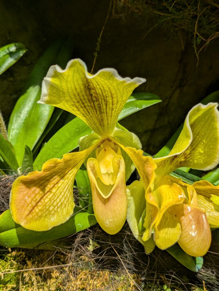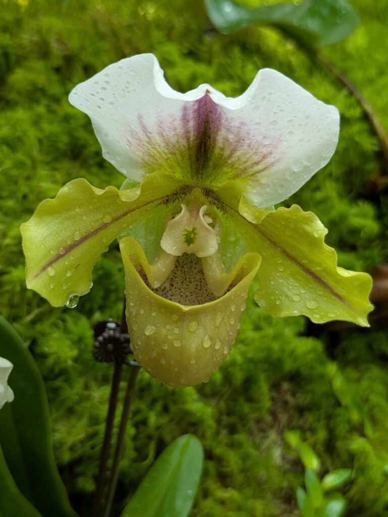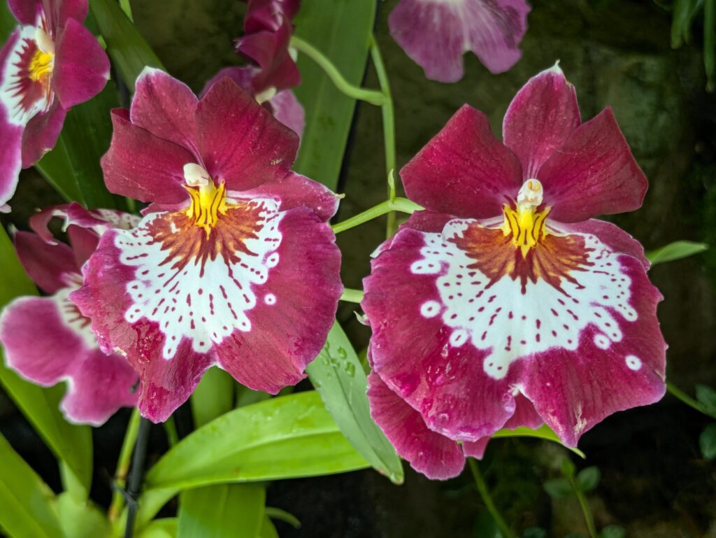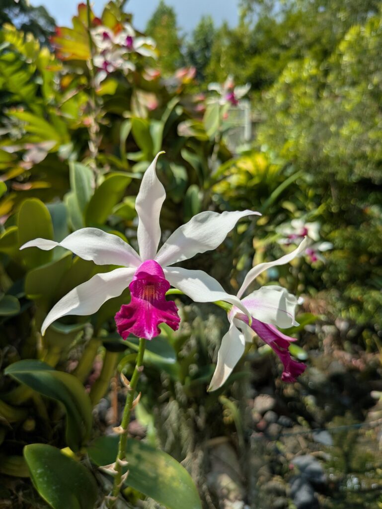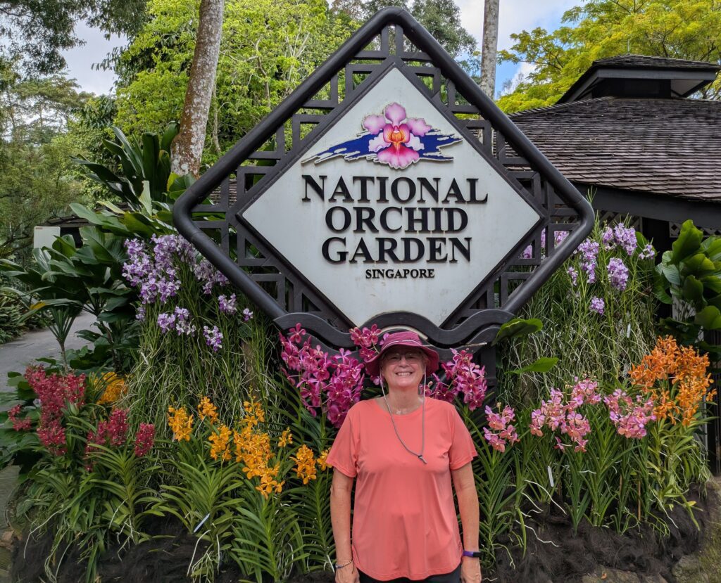 Then finally, we arrived at the National Orchid Garden. It is the largest tropical orchid garden in the world. This was an entry fee garden. As foreigners we paid more – I was S$15, which is $11.27; Jeff, as a senior, was S$3 or $2.25. This garden, inside a garden, was still big and had several areas of interest in it. One was The Semcorp Cool House. It was air conditioned and a nice respite. There were so many orchids in here. Gorgeous!!  As I have mentioned, we love Orchids. They are so varied. We left here and next walked up to the VIP orchid garden and Burkill Hall, seeing so many more orchids! Singapore is famous for developing varieties of orchids, since the 1930’s according to a placard. Also their national flower is one of these varieties, called Vanda Miss Joaquim. That is way cool! Lastly we went through the Celebrity Orchid Garden, seeing new kinds of orchids that celebs had endorsed somehow. We spent a total of two hours in the whole of the National Orchid Garden! I took a whole bunch of pictures🤯… it will be hard to pick which ones to use on the blog!