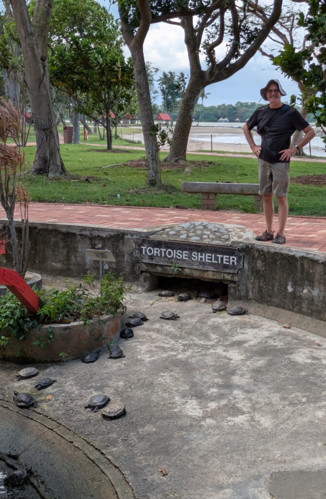 We landed and walked around this island. Kusu means turtle or tortoise in Chinese. The island is a “zoo” for turtle repopulation. There is a Marine center here – not open to the public but we did see an enclosure of many turtles, I assume are close to being released. But I don’t know and there is not anyone around explaining, or even placards… but I have QUESTIONS! Anyway, there was a Taoist temple on this island. There was supposed to have been a food court here as well – well there was a food court but is was completely empty. This is our impression of these three island: they are just here, but not set up really for tourists this time of year, as in no food facilities. Basically, all I really saw open was the temple here and toilets with showers. The history of them… seems like you could do something more with them. We sat waiting for the ferry to take us back, and watched a big rain storm coming to inundate Singapore City. It was so heavy you could not see what it overtook. We were hoping the ferry arrived before it came here. We were lucky and were getting on board when it started raining.
