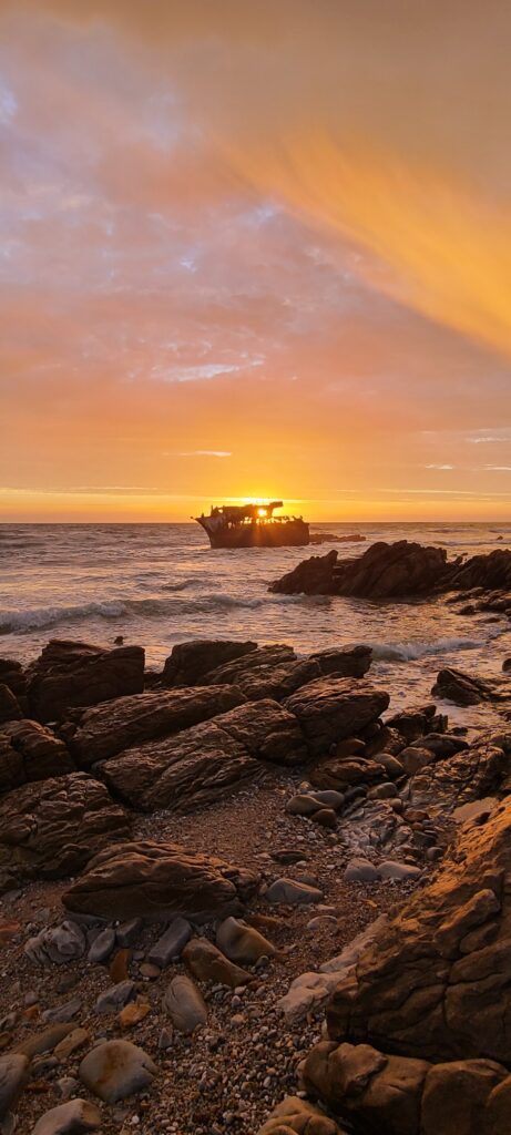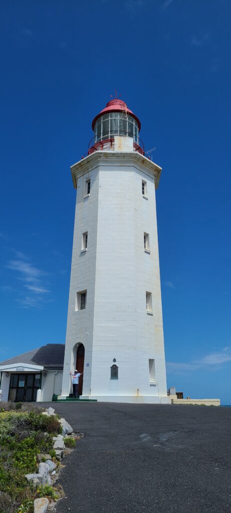 So we left Cape Town (hence the title change) and drove east and a wee bit south. We went down to Hermanus, where we saw our first Whales, Baboons, and Penguins – it seems so long ago, but was only on November 4th. We went on, eating a light lunch – nuts, dried apricots, and blueberries in the car. We entered new territory now, trying to stay near the coast! We went to Gansbaai and down a tip to Danger Point Lighthouse, established 1895. Here in 1852 the HMS Birkenhead wrecked on rocks. It was one of South Africa’s worst maritime disasters – of the 638 people onboard, only 193 survived, including all the women and children. Most of those who died were troops/reinforcements, because of their acts of self-sacrifice, courage, dignity, and heroism to save the women and children first. They stood fast on the ship so the boats carrying the women and children would not swamp! The lighthouse was not open – as has been the case so far 🙁 so no tour.