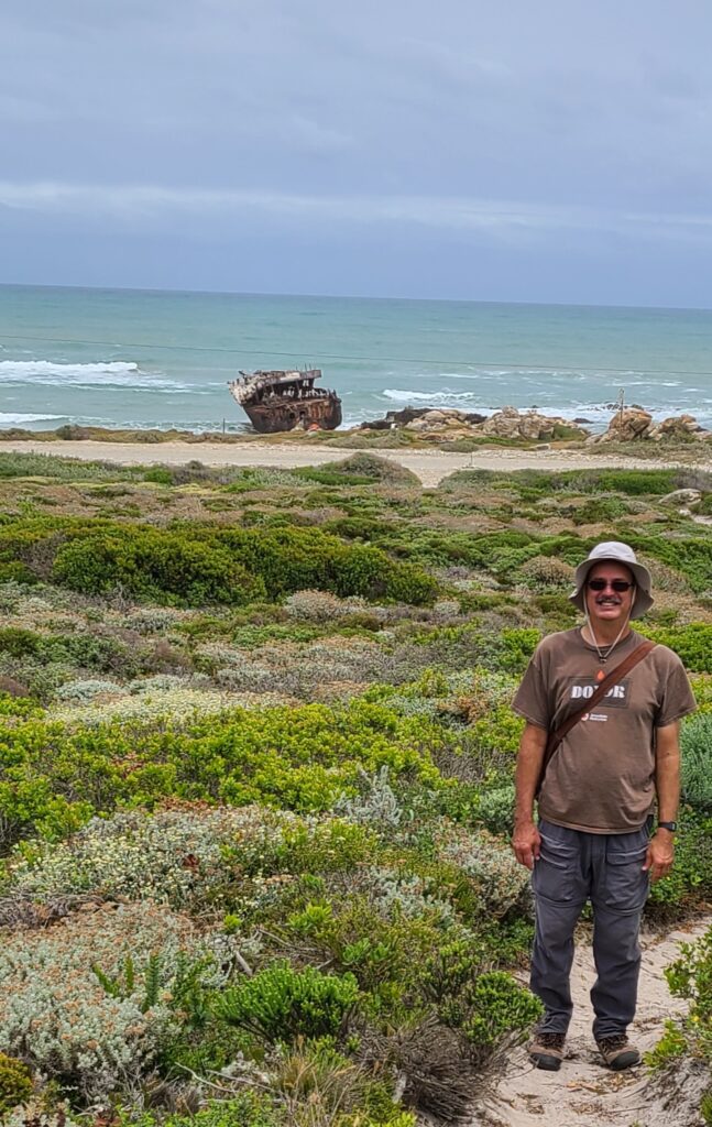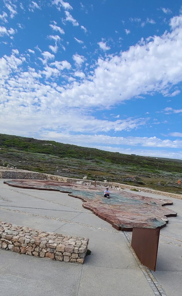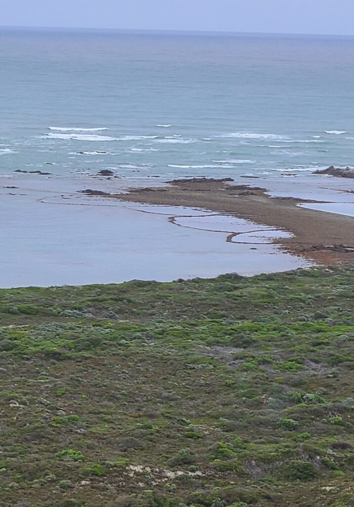 After breakfast we talked a bit with Cheryl, the hostess. Then we gathered our stuff and left. We went back the two, or so, kms to the Southernmost Tip of Africa, and on into the Agulhas National Park. to do a 5 km (3.1 miles) hike. It was a loop that encompassed along the shore and up about 350 feet along a ridge line the parallels the shore. The hike was very nice. The morning was cool with a rare drop or two of rain. We saw quite a few skittering geckos or lizards, butterflies and/or moths, and alpine-like plants with tiny flowers of all colors. The views were nice, cloud-covered, out over the meeting of the two oceans. It was a nice, easier hike. We also could see, from the ridge, the tide pools that the fisherman build to catch fish – a fishtrap. They placed stones in a stacked row. As the tide comes in – high tide; fish can enter the pool. But at low tide they are trapped in the man-made pool, and able to be caught by the fishermen. This has been going on for 20,000 years – so says the sign on the stone beach, that the national park put up.