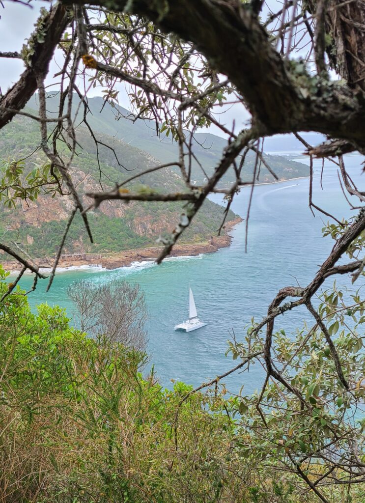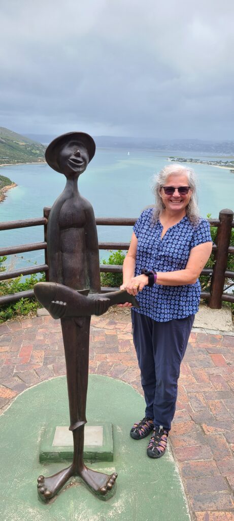 We decided to drive around this beautiful lagoon/estuary area that the city of Knysna almost surrounds. It seems to be a ritzy area. The grand homes all stagger up the hillsides. There are some very nice ones, eclectic ones, and very large ones! During load shedding last light, not many lights went out because almost everyone seems to have a back-up system! Anyway, the lagoon area is so vast because these hills/mountains have a narrow opening at the Indian Ocean, called “the head”. The lagoon is without surf also due to the head. The city has two islands in the lagoon, don’t know if they are man-made or natural. We drove around on both – first was Thesen Island, second was Leisure Island. Next we went on a walk that overlooks of the heads – stunning views of the ocean and back at the city.