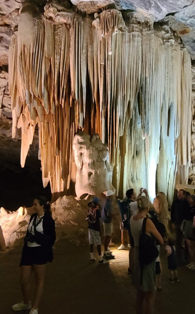 We now went north to Cango Caves (we saw Baboons on the side of the road – the biggest group we had seen). Arriving just before 1000 for the ten o’clock tour. Our tour was split in half due to half wanting an English tour, the other being German (which actually surprised me). Anyway, the tour commenced we were guided through two big rooms and couple other areas. There were some big ‘chandeliers’, ‘organ pipe’, great stalactites and stalagmites – as well as columns, were they meet. It was a spectacular cave, and we enjoyed it. We could not remember being in a cave in Africa – so we had to go! We felt blessed we did go! The tour lasted one hour and our guide gave us a tip for a brandy tasting for us, well me, anyhow! Yeah, for Paula!! Leaving the caves we head back onto Route 62.