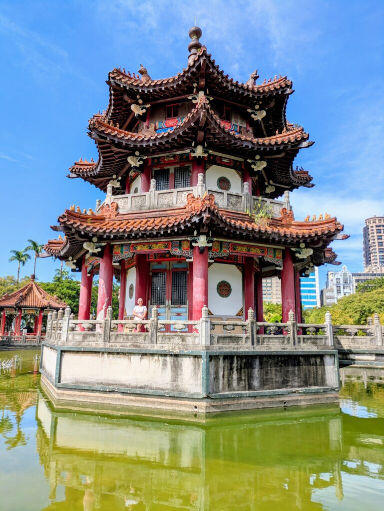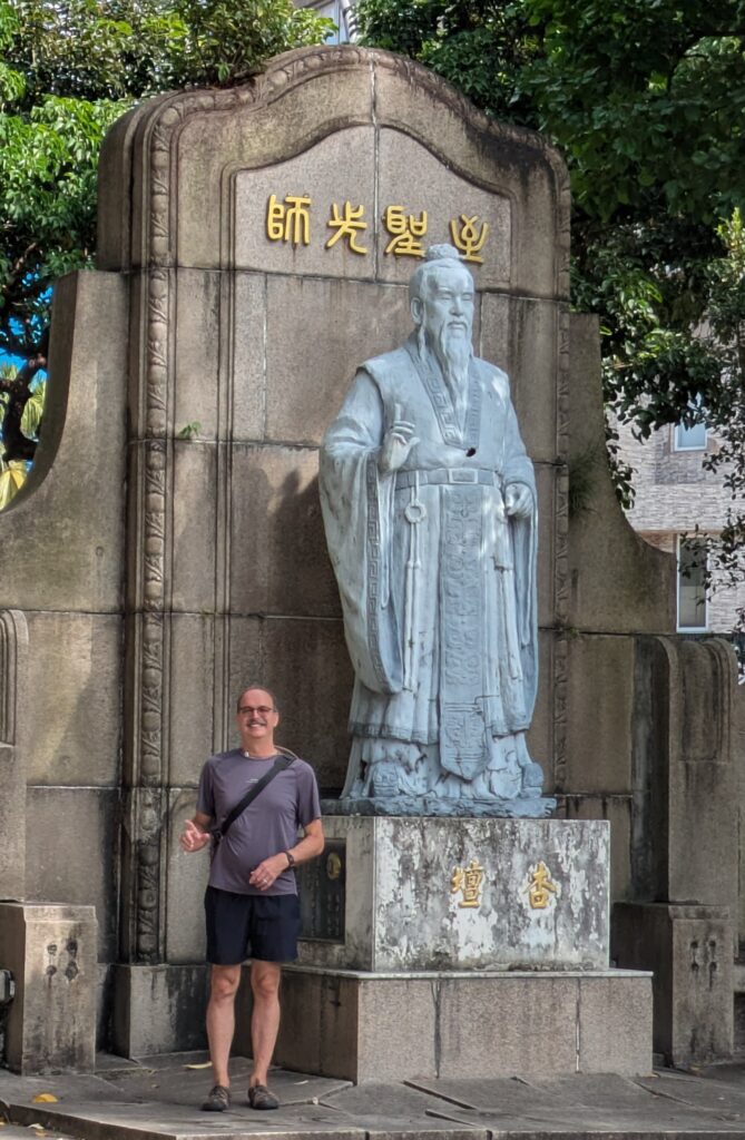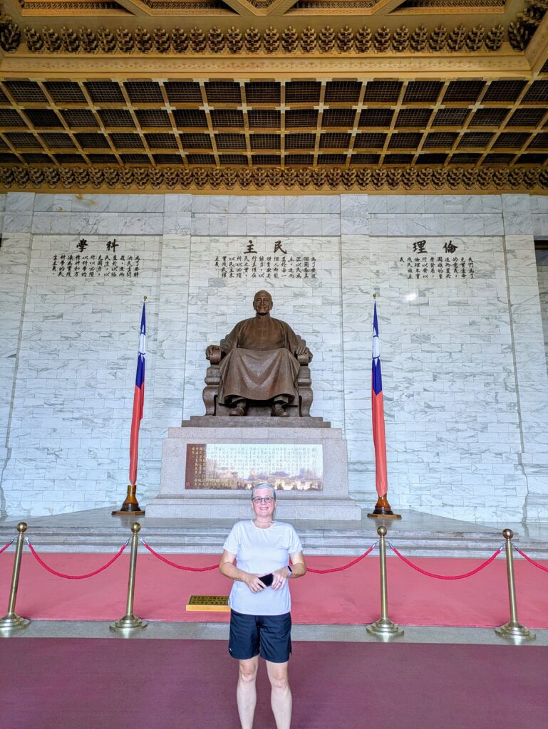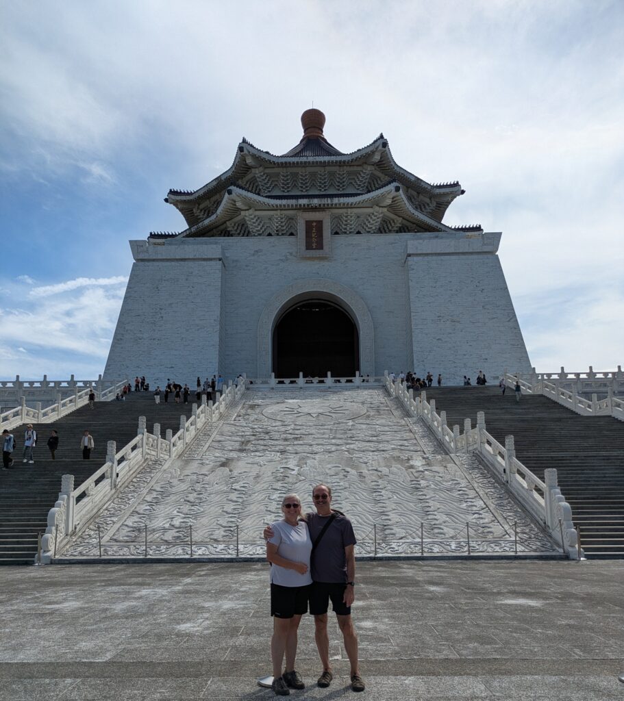 At the base, we exchanged photo taking ops with another couple (a Welsh couple living in Brunei). Then climbed the 89 steps – the age Chiang lived to be – to get up to the entry of the hall. Inside was a bigger than life, sitting statue of Chiang Kai-shek. It reminded me of Lincoln Memorial in the way they are both sitting and larger than life. Anyway, we did our selfie and then sat waiting for the 1100, Changing Guard Ceremony. It was pretty hot and just sitting in the shade we were sweating. We went down to the base of Chiang memorial and watched the ceremony from a front row position. It was just for show as the guards left, after the display – not anywhere guarding that we could see.