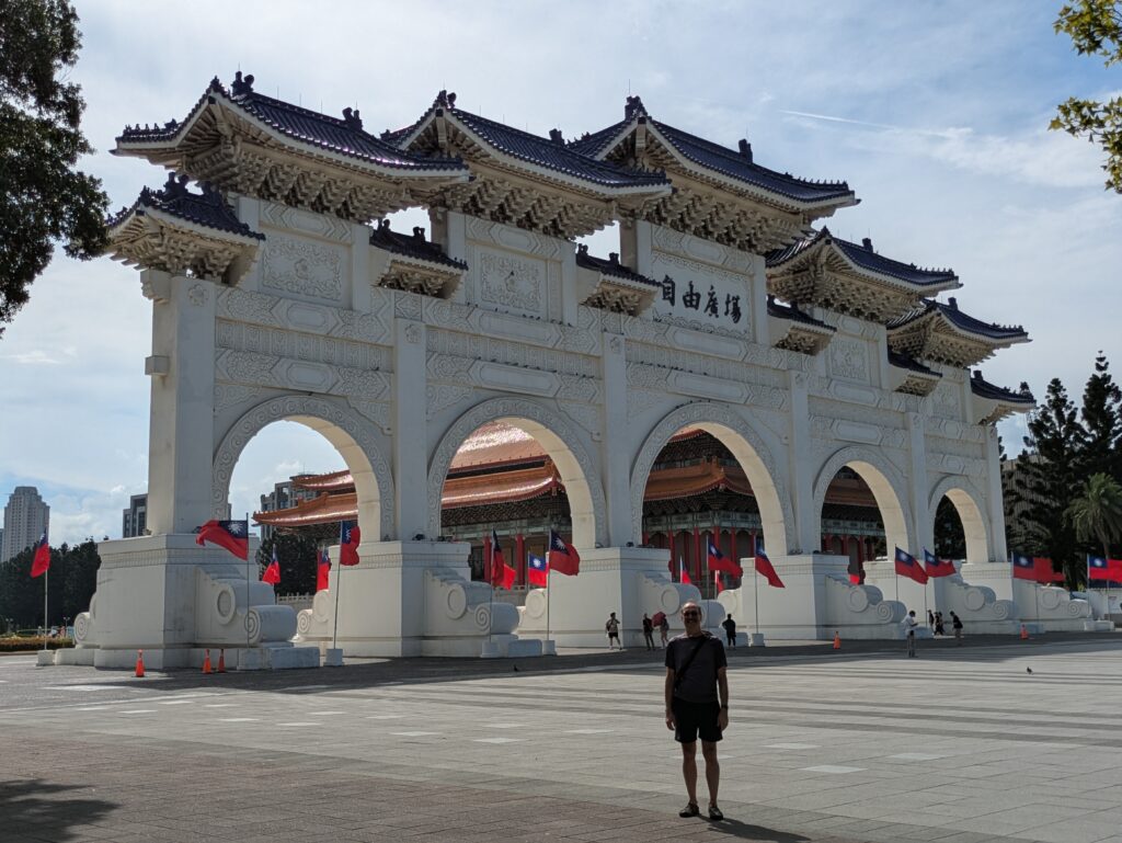 Next we walked to one of the top sights in Taipei. As we were walking we noticed something we had not seen in all of Asia that surprised us. It was dealing with scooters… some intersections here have a painted box for scooters to go to in the very front of the lane at traffic lights. All scooters have done this across Asia. But this setup makes it seem orderly and normal, not chaotic and messy. HUH?? Anyway, we arrived at Taiwan Democracy Memorial Park to see the Chiang Kai-shek Memorial. Chiang Kai-shek was the general-leader who founded the Republic of China and set it up here in Taiwan in 1949, after he and his forces were defeated in the Chinese Civil War, (taken from Wikipedia). The entry of the park was through a massive gate that opens to the memorial itself in the distance. It is huge, but does not seem that large – at first – because of the distance from the entry to it. The vast park was designed at Chiang Kai-shek’s death in 1975, according to a placard, and completed with its opening in 1980.