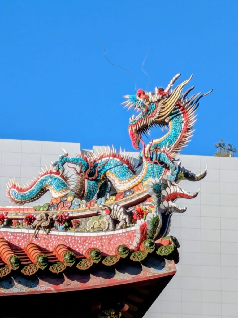 Now we walked to the Bangka Lungshan Temple. It is a famous Buddhist, Taoist, and Confucian temple built originally in 1738. It has been rebuilt numerous times due to fires, earthquakes and most recently from American bomber destruction in WWII. The main courtyard had a big waterfall area opposite a pond area flanking the actual temple. Inside the temple was very crowded with many worshippers reciting together in unison from a booklet they all held, and tourists walking around taking pictures. It made me feel awkward- like I was interrupting a service as I was one of the tourists walking around. HUMM…the paradox.
