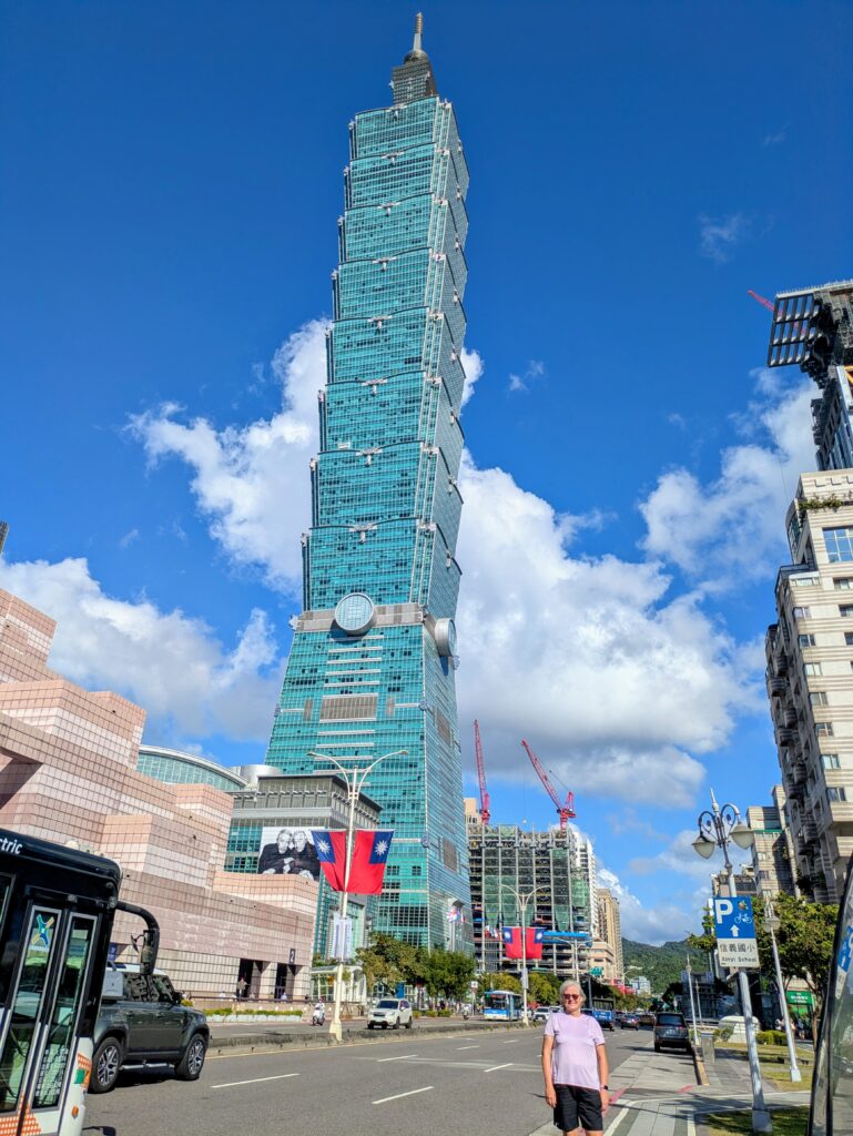Then went to the subway, and took it to the Taipei 101 Building. This was once the tallest building in the world from 2004 until 2010 when the Burj Khalifa was completed. We do not have the desire to go up in the tower, but we had to go admire it from below. It is a pretty green hued exterior. We took our obligatory photos, oohed and awed, and then took the subway back to Chiang Kai-shek Memorial. We wanted to see what the Falun Dafa final display looked like, but when we arrived at 1501… the huge display taped on the cement was all gone!! So all that work they were doing was already taken up! Crazy!! Anyway, we went up toward the memorial itself to catch the guard changing procedure and saw a row of tents. They were selling food, drinks, and tourist-type items. We were glad the ‘tent city’ was not set up yesterday as it took away from the grandeur of the memorial. The guard changing was the same as yesterday. We left here as it was pretty hot.