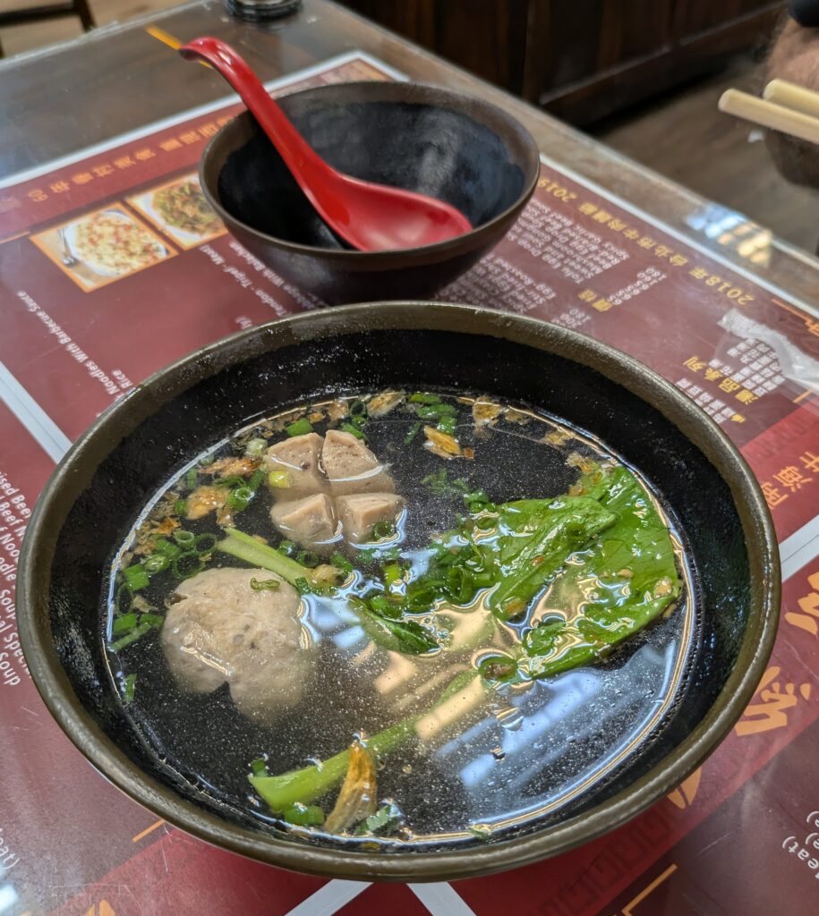 Around 1230 we went out, braving the rain. We were stir crazy! I think I was more than Jeff. We went to the food court where the Beef Noodle place was, but nothing sparked our fancy. So we meandered until we saw a food street and duke into an alley with a restaurant, called Manchu Beef Noodle Restaurant. We ordered Mushroom Gongmaru Soup; Scallion Pie; and Xiao Long Bao (Soup Dumplings). It was all very good. The mushroom soup was a great clear broth with two meatballs – I assume were pork. The green onion (scallion) pie was stemming hot and like two pieces of naan with the green onion sandwiched between them. And lastly the dumplings… they were better than the first time we had bought them. A little pocket of soup with a small pork ball wrapped in a dumpling, served with a ginger soy mix for dunking them in. YUMM!! We both enjoyed the whole lunch. When we finished, we went to pay the 261 TWD or $8.49, she dropped it to 260 as she didn’t want to deal with the one TWD, or three cents.