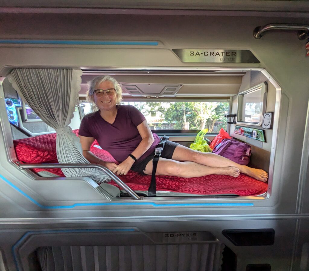 Anyway, the bus was there already and we boarded. It’s 0745, and in five minutes we are under way. We both have an upper “lounge” compartment across from each other. Total ticket price for both of us was 1.2 million Dong ($47.40). The whole bus is made up of twenty of these compartments. Each lounger has a seat belt! Yes👍!! The bus drove just a couple of minutes and stopped –right at our hotel street!!🫤😜 We wouldn’t have needed to do the scooter mess and adrenaline rush ride, if only we would have been told of this stop. Anyway, we move on, after loading up seven or eight more people.