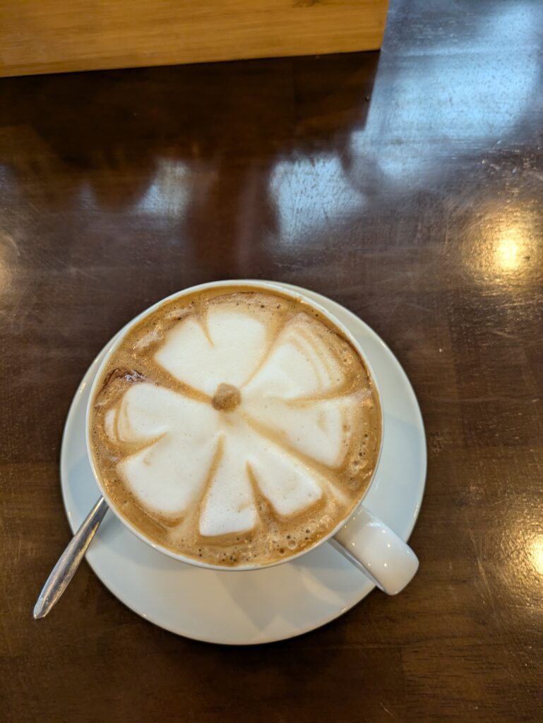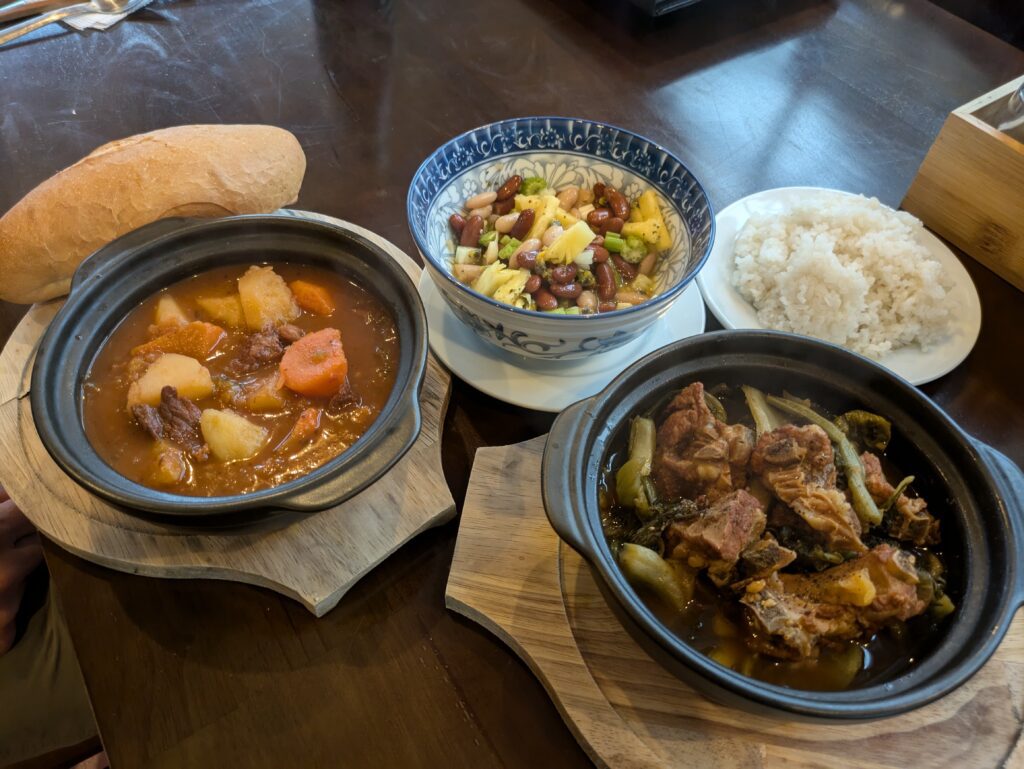 We unloaded and started walking to get dinner. Our host guy gave us use of a scooter – for free – to go. “It’s too far to walk in rain,” he said. That was nice!! We drove to Lotus Restaurant in a misty rainy, barely got wet. We were greeted and ordered a Colorful Bean Salad – had red beans, white beans, pineapple, passionfruit seeds, onion and celery with a rice vinegar dressing (like a 3 bean salad, but not really–‘same same, but different’); Stir-fried Pork Spare Ribs with pickled mustard greens & rice; and Beef Stew of beef, carrot, potato, onion and local red wine with bread. I had a great Mocha Coffee and Jeff had a Saigon Beer for our drinks. We enjoyed the meal heartily! Comfort food for a cool, rainy day.