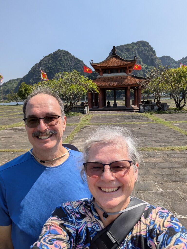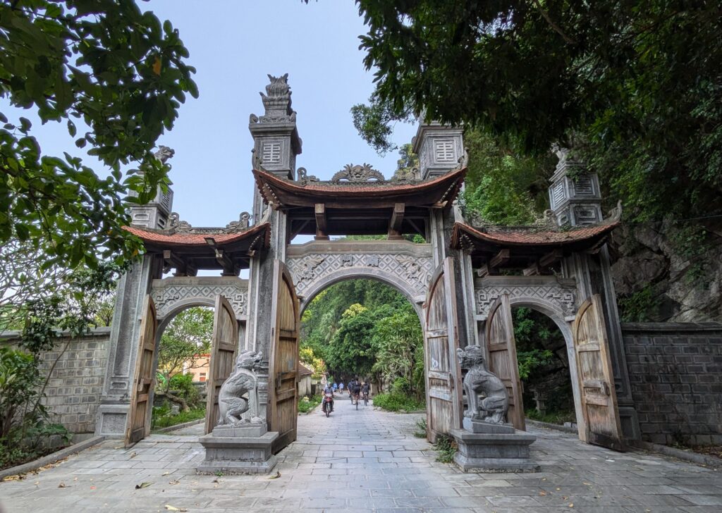 Anyway, our first stop was Hoa Lu, the Ancient Capital. At the site, we paid 20K Dong each (basically, 80 cents). A big banner over the entrance announced “Celebrating the 1,100th Anniversary of the Birth of Emperor Dinh Tien (924-2024)” as per Google Lens/Translate. We walked in and noticed goats roaming at the gate with a couple of kids. There was a big grand square that is empty (as in no people) except for a pavilion in the center. It is small compared to the square. without anyone there we just followed the people. We came to the Temple of the Dinh Tien Hoang King. It seems Hoa Lu became the capital of the first feudal monarchy, under this self proclaimed emperor, paraphrasing from a placard. We visited this temple. I liked the gardened entry, the colorful painted creatures at the cornices of the temple, otherwise not much else to note. The main display is only viewable through a barred window of the entry door.