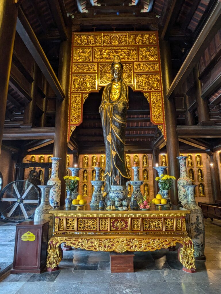 There is so much here it is hard to continue writing, overwhelming… what to say? (Info here is from many different sources on the internet, including the QR code info from Bai Dinh). First there are at least 15 areas/buildings identified on the map of the 539 hectares complex. The original, old Bai Dinh pagoda was built in over 1,000 years ago – dates vary. It is humble and nestled by trees on a hillside. Next was the Three Gates and this is actually where you start for all the new part of the complex. Then were two parallel long corridors. One for entering one for exiting. Each one was 1700 meters long, which is just over a mile, called the  Arhat Statue Corridor. It has 500, larger-than-life Arhat statues (which are disciples of Buddha) lining the way and length of the hall. Behind these statues were many golden sitting Buddhas all lit up.