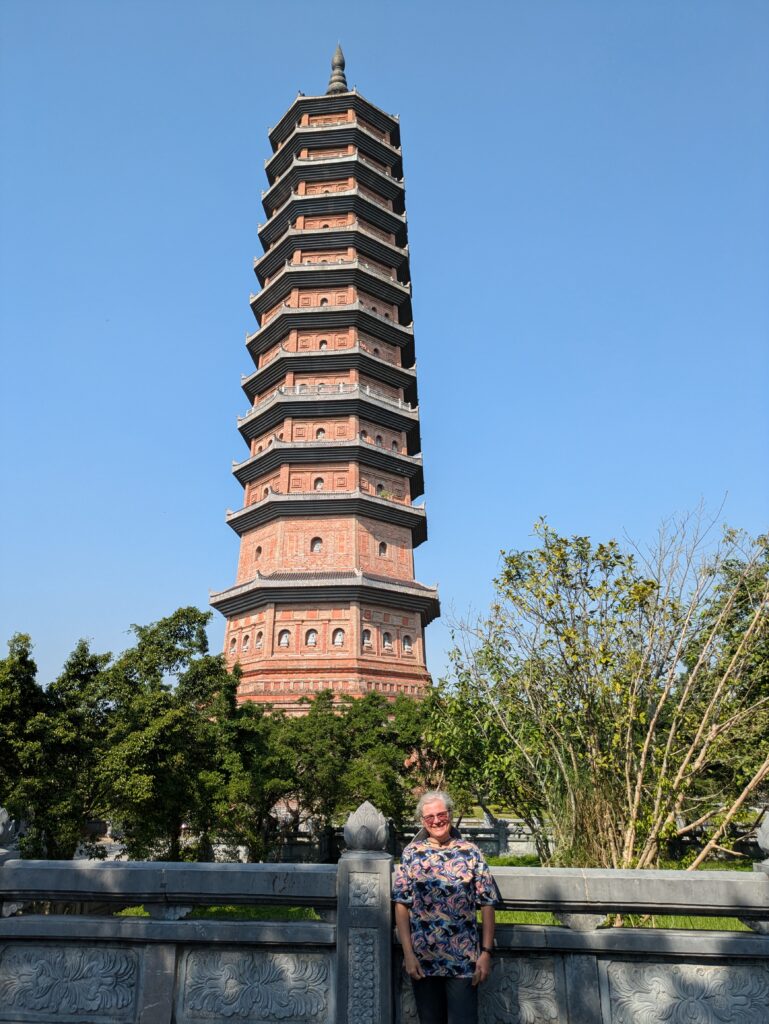 Now we see other areas an enormous gate, a cutting of Bodhi tree from Sri Lanka, a Buddha-Worshipping Cave, and a few lesser temples with one or two more caves. We were zapped of energy (having like 11,000 steps -elevation steps already) and about “templed” out. We ate our bananas, crackers, and bought two small waters – having already drank our large one. We went to couple other places, lastly we went to the Bao Thien Stupa (or pagoda, not sure which is correct terminology.) We arrived and had to pay an extra 60K Dong each ($2.37). We also had to put on shoe covers (other places here, we had to doff our shoes). Anyway, this is huge: only13 floors, but it is 100 meters tall (328 feet). Once inside you climb up two flights of stairs, passing by Buddha statutes and reliefs of his life; and then take an elevator to the top, thankfully. (Somewhere on this 13th floor are Buddha relics brought from India.) The views up here were amazing and you can finally appreciate the entirety of the behemoth complex. We also saw the Maitreya Buddha Statue, that we chose not to go up to. There is also a Convention Center and Hotel here!