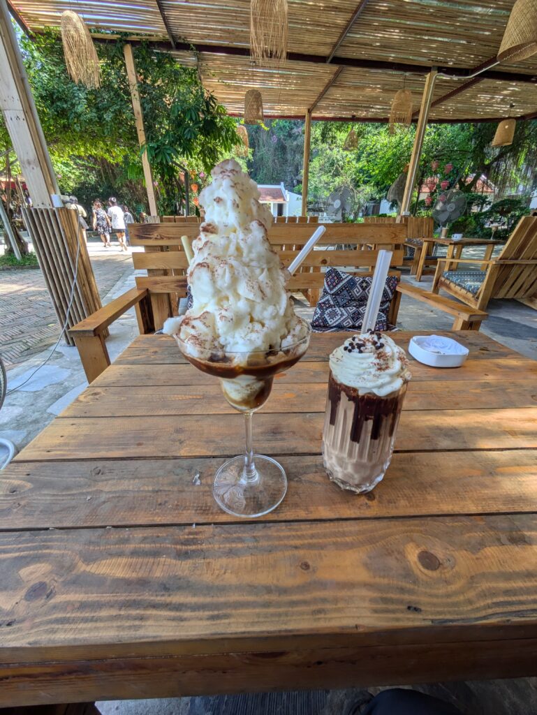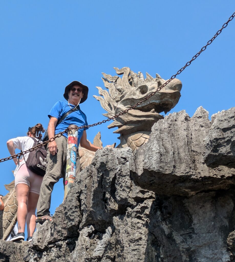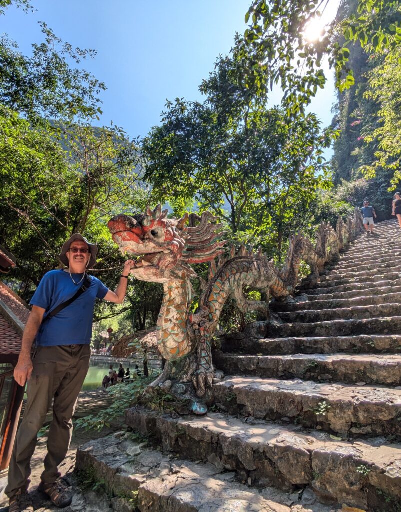 We arrived at Hang Mua around 1030. Jeff had to pay 10,000 Dong (40 cents) for parking the scooter, then he paid the 200K Dong each for our entry ($7.91). Now we climb the 500 steep steps up to the top. About mid-way up the steps split in two directions. We went to the left first. At the top is a cement sculpture of a dragon dancing on the ridge line. It was super crowded!! I think every tourist in Ninh Binh is here! The views from here, incredible – a 360 degree view of the land that is Vietnam. You can see out over the rice paddies on one side and the Lotus ponds on the side where we came up. You also see the right fork with a tourist trail up to the pagoda and another hilltop with a pagoda and no people. Then I got to where I could see the dragon’s head and a couple of humpy-waves of it’s body, with many people up around it. Jeff went on up the last ten feet and “danced” with the dragon – vying for a photo-op. Then we came down to the fork – Jeff went up the right fork, with a pagoda on top. I did not go and waited for him at the “crossroads”. It was good with great views (albeit hazy), I’m glad we went. The last few feet down I was able to get a picture of another dragon – on the rail of the steps. Once down, we stopped at one of the many cafes for a drink. I had an iced coconut coffee and Jeff had a chocolate milkshake. Nice way to cool off!