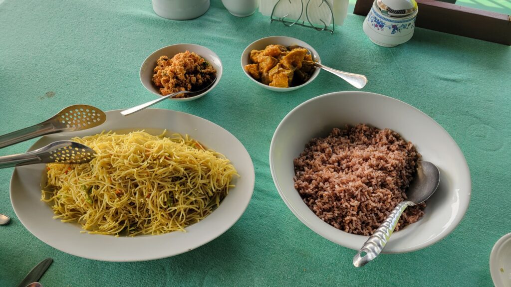 Up and around, and went for our last huge breakfast! We were served banana fruit cup, first time we did not have papaya. then the main: a big plate of seasoned noodles; serving bowl of red rice; regular bowl of pumpkin curry; regular bowl of coconut sambal; X6 toast with butter and jam; X2 coconut roti; and rolled pancake X2 with service of tea. It still blows us away how much food Jeff and I have been served. We finished, Jeff settled the bill, and we boarded the tuk-tuk the manager had called for us – after we said goodbye to all, including our view!