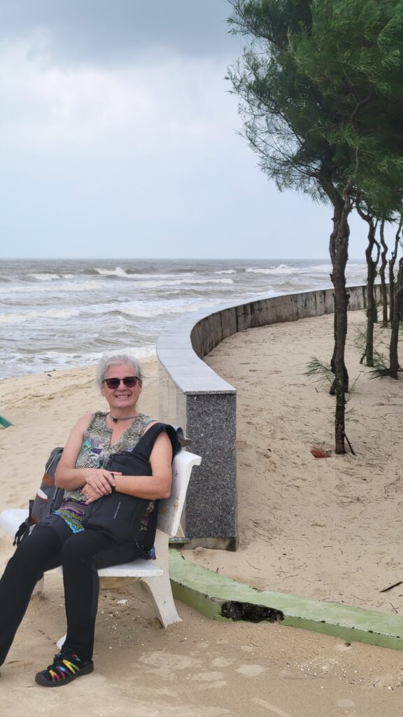 Jeff checked the counter to see if there is a earlier train. The lady had to phone someone who spoke English. No there is not an earlier train. We were able to leave our luggage for 50,000 Dong (about 2 bucks). We went to the cafe, Sophie Homy – the lady Jeff spoke to on the phone. She told us how to get to central part of town since we weren’t hungry yet. We set out and walked, just exploring and getting steps. We went through and beyond central district of town, to the beach. This town is pretty much the center of Vietnam and right on the coast. The beach area here is more than deserted… it feels abandoned. We think the tsunami caused it. The online pictures are nothing like the reality we see before us. There is hardly a beach, only a few feet and a huge drop off. Anyway, we sat and watched the ocean surf for a little while we ate a banana each. We noticed a big dark cloud rolling in so we decided to head back. Jeff actually called a Grab Taxi and we went back to the train station. It was 1430. Our train doesn’t arrive until 1700. We went back to Sophie Homy and had “lunner”. We had Sweet Potato Fries; Stir Fried Pumpkin with Garlic; and Stir-Beef with Lemongrass. Jeff had two beers, I had a cider and a Coke. Then I blogged as Jeff went to a convenience store, for a snack on the train.