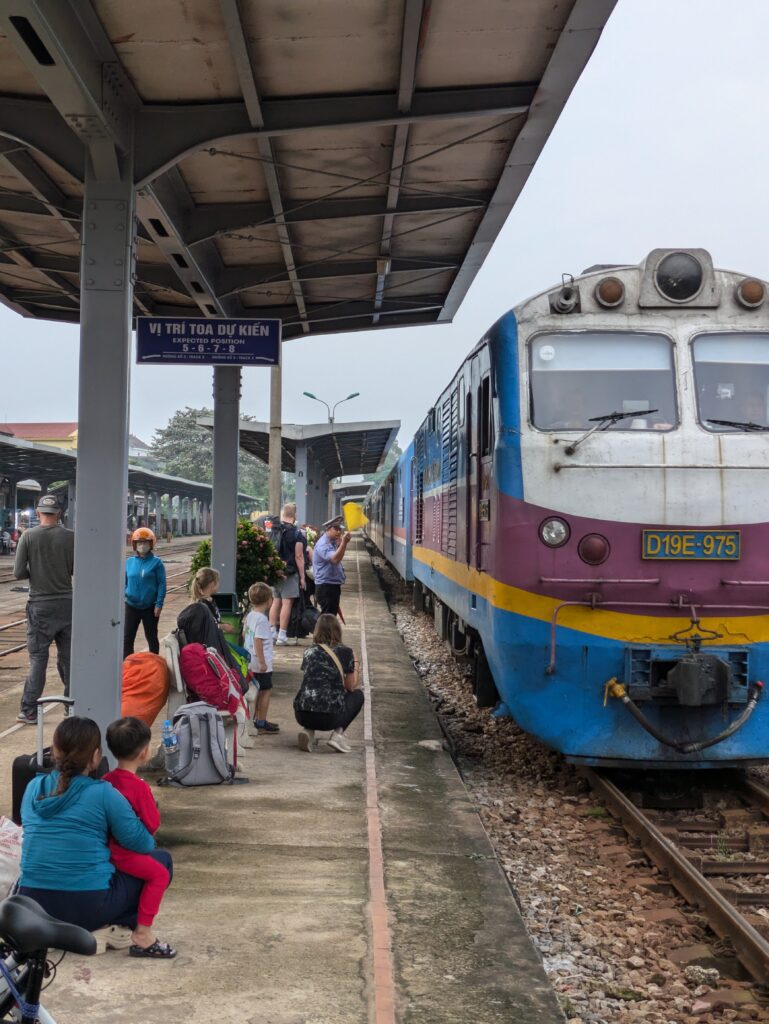 Finished, we went up to our room and packed up. The whole day will be transitioning day to Hue. Our host will drive us to the closest train station. First, Jeff paid up our tab. We loaded up in our hosts car and left around 1140. The drive is 50 minutes. We pass by the less flooded rice paddies of the area. It looks like rain, but we never had any. We could have stayed in Phong Nha until around three, but we wanted a change. Anyway, we arrived at Dong Hoi. It seems a bigger town. He delivered us to the train station. It was 1230. We thanked him. We enjoyed his little bungalow – he was a great host.