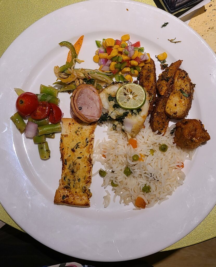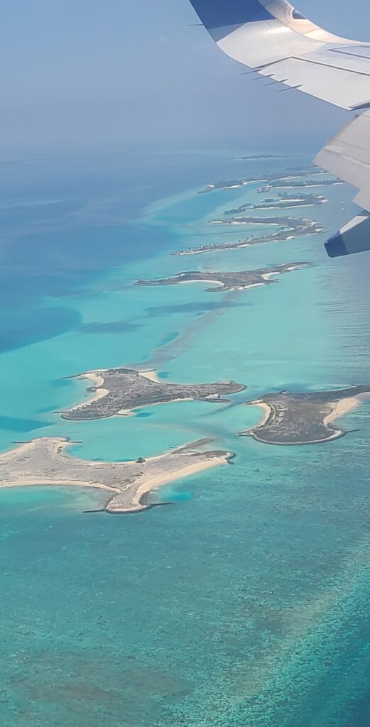 Today, we awoke before our alarm of seven – me at 620, Jeff at 445! We got up and about by 630. By 710 we were walking with our luggage, to the airport. Along the way a tuk-tuk stopped and offered to take us rest of the way (not far, probably 2/3 a mile) for 50 Rupees ($0.60 – yes, that’s sixty cents!). Through a security check to enter the airport. Again checking in, with our checked bags going on their venture!🤭  Then  we went through security, then immigration, and then to the lounge. We arrived here about 0830. We had breakfast of Poha and Upma (Some of our favs!! The day is starting out well!); cinnamon rolls (that glanced at the cinnamon container while being made); yogurt; Gobi (cauliflower) paratha. Jeff also had a croissant, muffin, and a hushpuppy. I had a coffee (very bitter😖, had to add a lot of sugar, whew). Anyway, we left the lounge just before ten and arrived at our gate, just as they were lining up to board. We go directly onto the plane – no bus, no tarmac! Sitting waiting for everyone to load I became nauseated! Really?!?  I took some nausea medicine. Pooh! We backed out at 1045 – five minutes late….  heading to the Maldives.