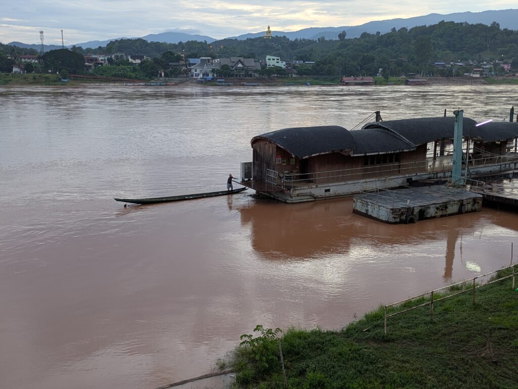 We drove north a little into the town of Houayxay, arrived and checked into our accommodation, Oudomphone Guesthouse 2. The staff interestingly put a single guy and a single girl in one room… which they oddly were okay with. We unloaded and went out for a light supper and to explore a little. We saw a little road that went down to the river edge so we took it and found My Laos Restaurant. We ordered a “little bit” Spicy Cucumber Salad, and “Chicken Row”- which we think meant Chicken Rolls. Jeff had a Beer Lao and I had a Somersby. Just as we received our food we had to go inside due to a rainshower. It was enjoyable watching the Mekong River, seeing Thailand, and being in Laos. We paid 300,000 LAK (was 269,000, but Jeff did not want to deal with the extra cash). 300,000 Laotian Kip is $13.93. The conversion is getting back to the ridiculousness of Vietnamese Dong!