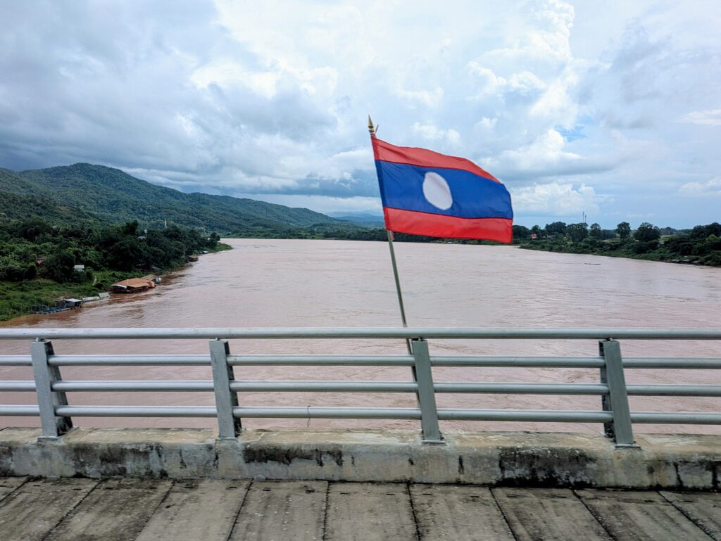 Around 1510, we turned onto #1356 road. Finally this road takes us to Chiang Khong Vehicle Border Checkpoint. We were processed out of Thailand and had pictures taken for Laos. Then we waited for another vehicle to take us and others through half a figure eight pattern to cross to the right, correct side of the road. We crossed the Thai-Loa Friendship Bridge #IV, over the very full, fast flowing, albeit- muddy Mekong River. Then we unloaded and went through Laos Border Control and Immigration Office. Our Laotian Tour Guide representative gave us two forms to fill out each (thankfully I can write mostly now). We were all approved and all loaded into another bus.