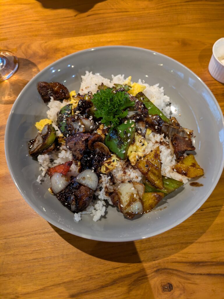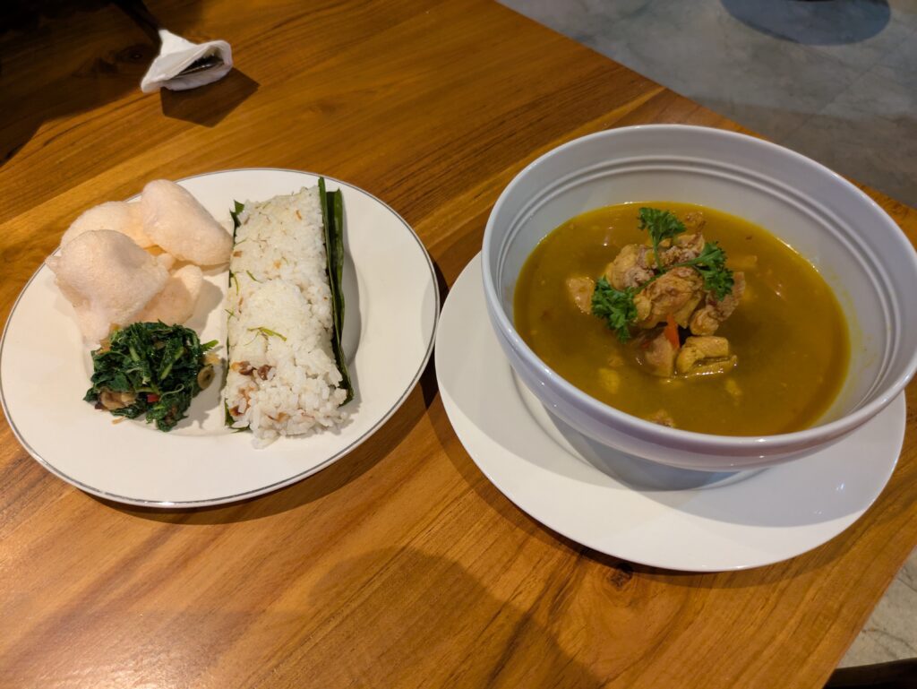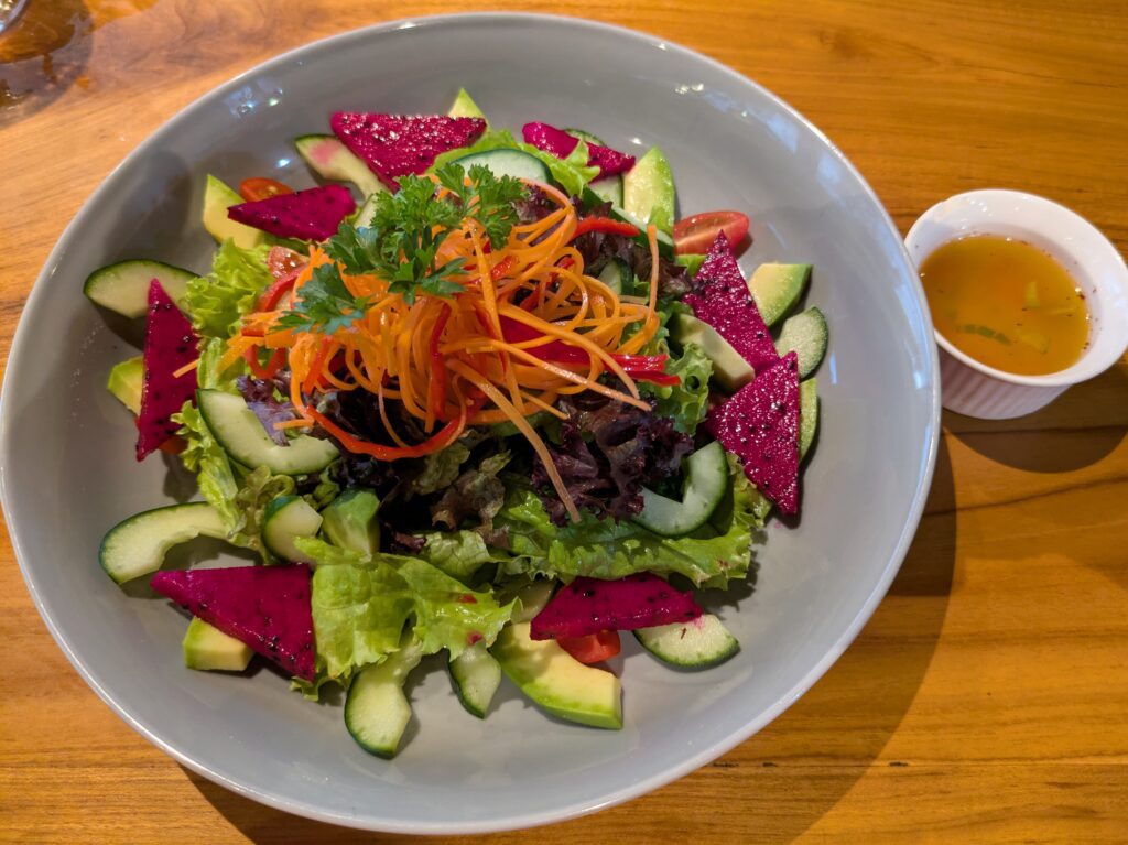 A couple of hours later we walked to find the local place, we had scouted out. The place was called Wiri’s Eatery. We ordered a Fresh Garden salad with lettuce, carrot, tomato, cucumber, avocado, and dragon fruit with a passion fruit dressing; Balinese Ayam Timbungan, which is a soup of chicken & spices cooked in bamboo, served with grilled coconut rice and a condiment of crispy melinjo; and Banh Mi Rice Bowl, which was a rice bowl with stir-fried pork belly, onion, peppers, and scrambled egg. The food was presented well, very good, and yummy!! 😋 I had an iced ginger tea and Jeff had an Arak mojito. We paid 251,763 IDR, or $15.26.