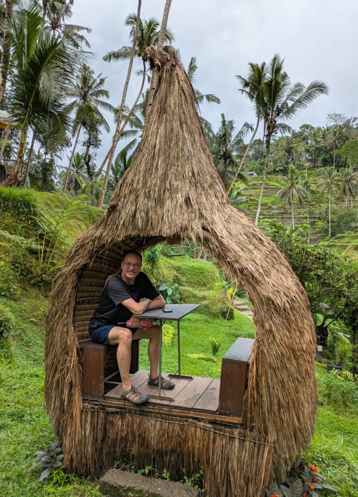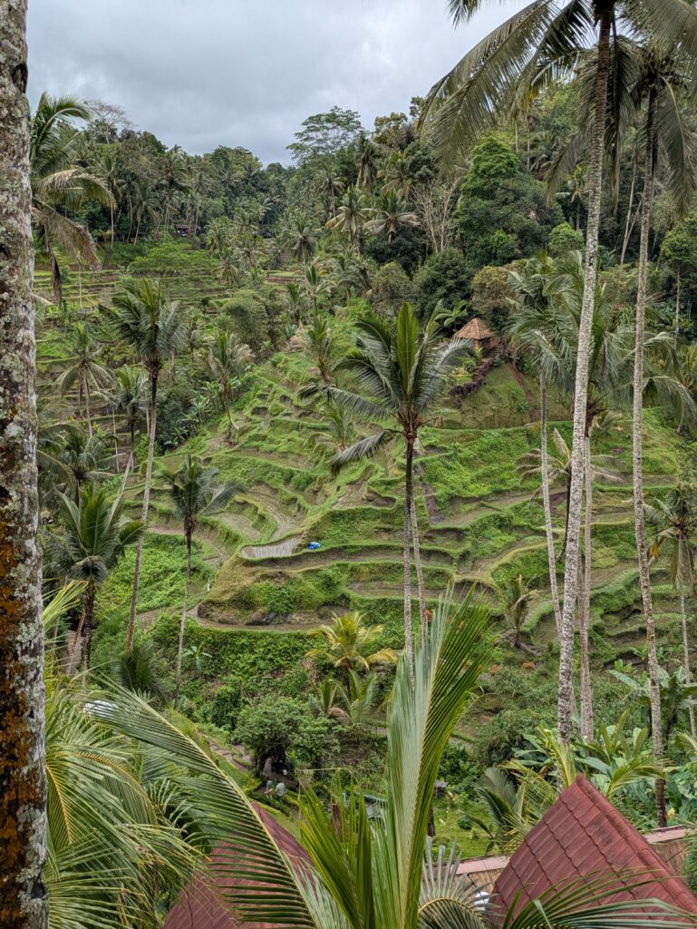 Anyway after this Eureka moment, the rain stopped again. It looked like it may be stopped for a while?? So we went out. I was stir crazy! We went up to Tegallalang Rice Terrace. It was a 7.7km drive, or 4.78 miles. We took our time and took in the new areas we had not seen yet. The town is less built up, traffic is better, and we see more rice paddies. Some paddies are being worked and planted. We found the parking – after one falsely advertised “free parking.” We paid 25,000 IDR ($1.52) each to enter. The terracing is more of an Instagramy place with swings, and ziplines as such. But we could walk through and down the one side of the v-shaped area. To go to the terracing on the other side you had to pay more money to walk across a bridge or pay by doing a zip line across. One zipline was “riding a bicycle across. The swings were very long roped and you went over the edge of the terrain. We took a couple of pictures, but mostly just enjoyed the scenery and no rain! We watched some zipliners and swingers.