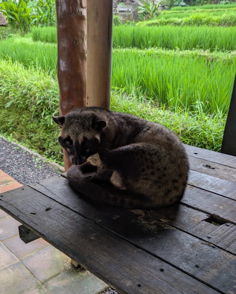 We loaded backup in our vehicle and started back. We pulled off at the Coffee Garden shop, as I will need some coffee in two days. It turned into an experience. We were toured through a garden and told of various plants including coffee, and tea. Then we came to an area of a demonstration of roasting coffee and our guide showed us a Luwak, a nocturnal animal. The animal excretes the beans and this is where they get their coffee. I did not want this kind of coffee… and I said as such. The guide assured me they had other coffee. Anyway, we were finally taken to the tasting area. I ordered a cup of the Bali coffee- “non Luwak variety.” She came back with a huge sampler of all their coffee and tea varietals! For Free!! Well, okay. I tried their black, non-Luwak coffee, and nope it was not for me. We did try all the varieties though. Many of the samples were creamy and sugary. This was how Jeff was able to sample the coffee ones. We both liked the ginger coffee and tea. There were a total of 16 kinds to sample. After we finished, we went to the shop. We were thinking of getting a bag of ginger tea, but it was a power form and expensive for the amount. We opted not to get it and Jeff just paid for my cup of Java 35,000 IDR or $2,13. I’ll have to look up roasters in earnest, especially non-Luwak ones. We loaded up and left.