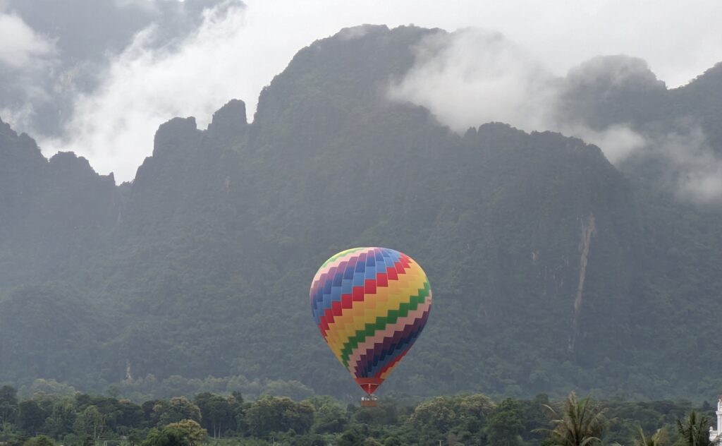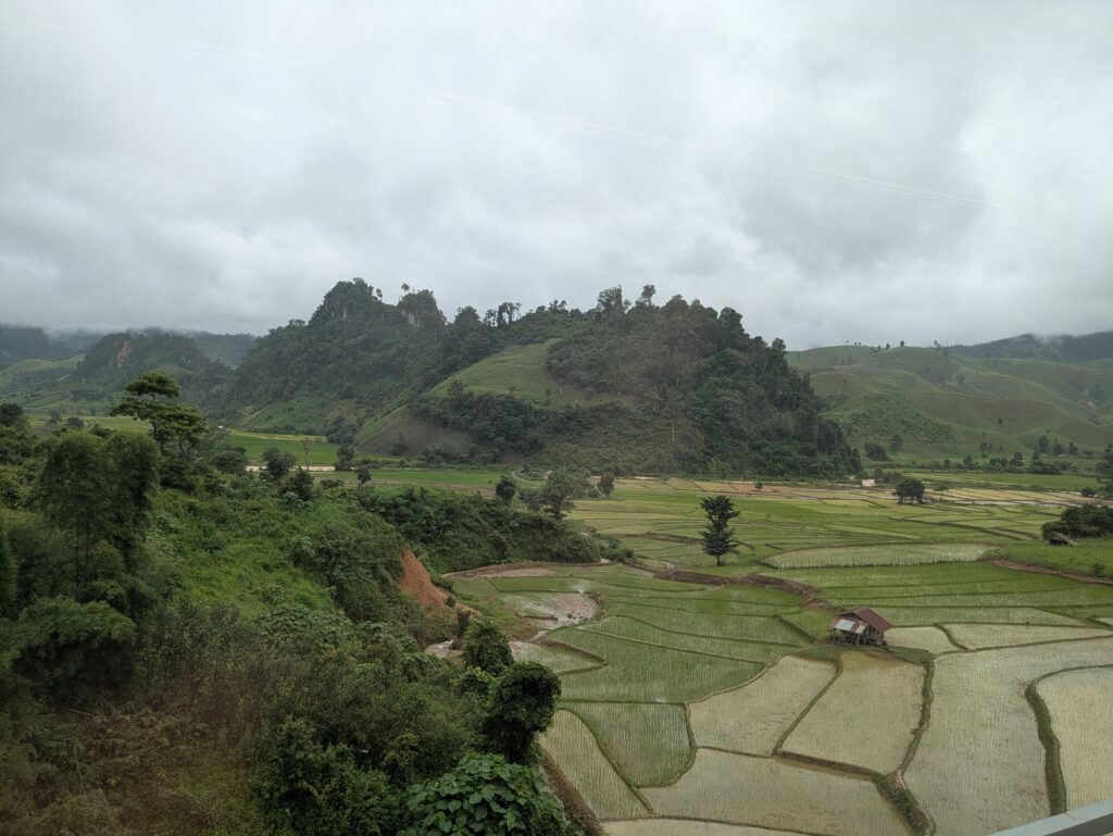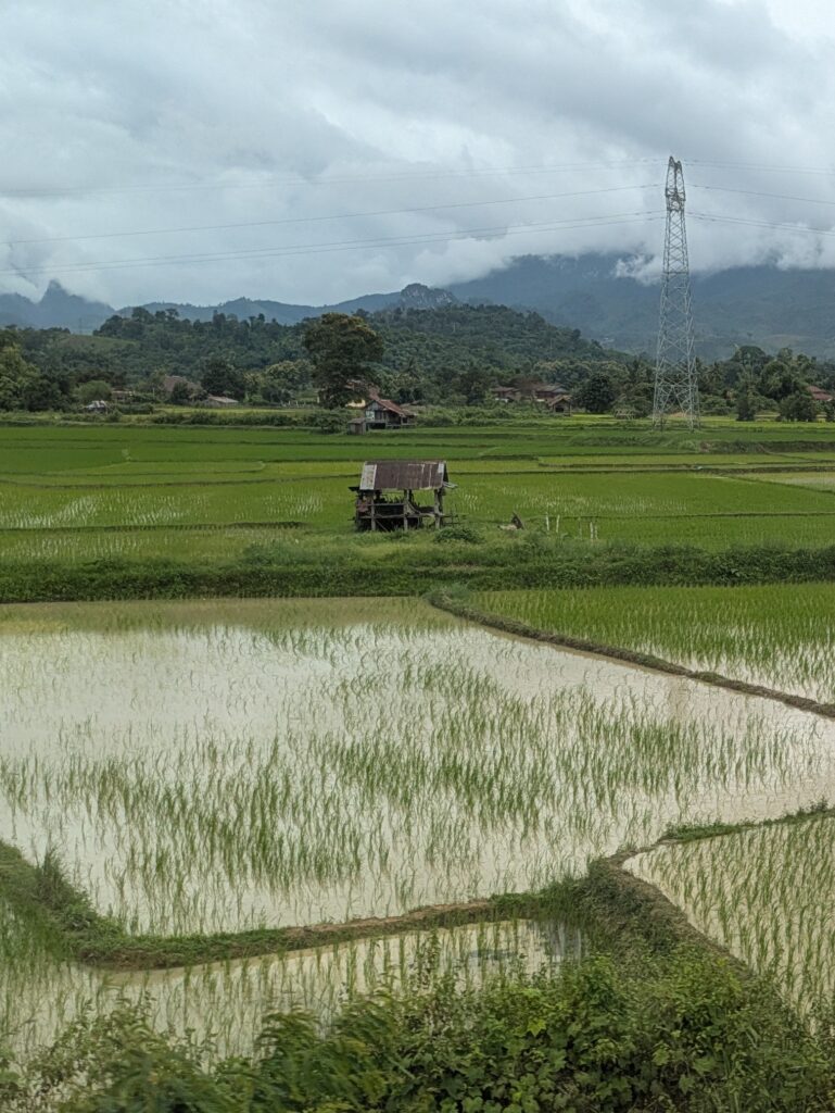 Anyway, we arrived at Laos Fast Train Railway by 1135, having to walk a little ways to get into the station. Our luggage was scanned and we probably would not have needed to have mailed our pocket knives. Nothing was being flagged – maybe they have loosened security a bit. Oh well, better safe than sorry. At 1150, we were in line to have our E-tickets checked and to go out to the platform. By 1205, we were in our seats on the high speed train to Vang Vieng. The train began two minutes early at 1220. The inside was arranged in a two seats and three seat configuration. The seats were comfortable and spacious. The car is split with half seats facing one way and the other half facing us. We were sitting facing the way we came. This is not ideal but turned out fine, because we passed through 27 tunnels – give or take one or two. The rail line was cut through the mountains. We think we spent as much time in a tunnel as not. When we did see the countryside, there were small villages, many terraced farms of various grains, but mostly the everpresent rice paddies. The train’s speed was posted and reached a speed of 159 km/hr or basically 99mph. It was a smooth ride and quick. At 1316, we arrived at our destination.